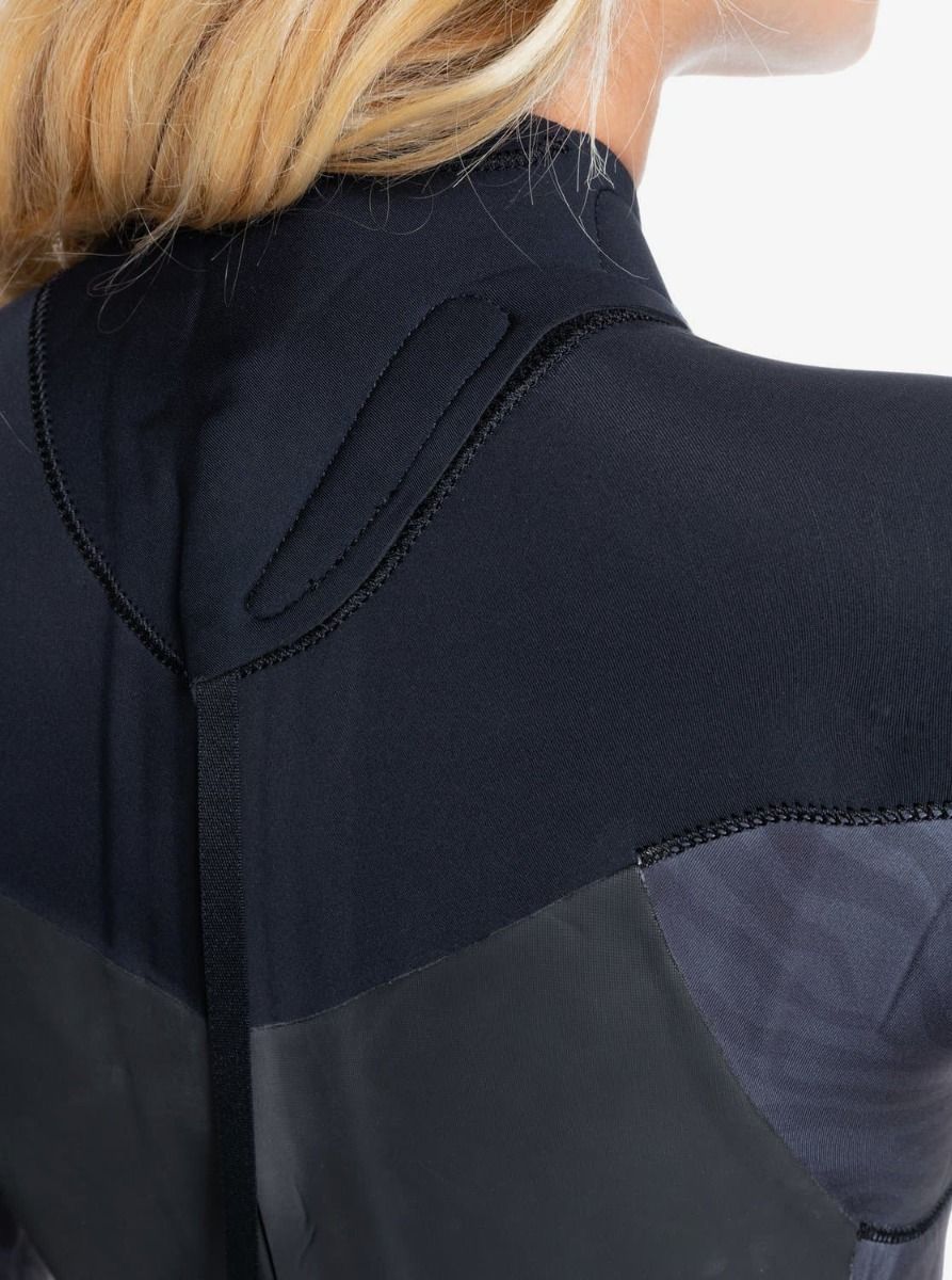 Este traje de surf para mujer con grosor 5/4/3 tiene entrada de acceso con cremallera posterior de plástico YKK® #10, neopreno Thermal Smoothie en los paneles del pecho y la espalda, tejido interior de polar térmico WarmFlight®, costuras GBS con triple encolado, puntadas invisibles y sellado interior con tira StretchFlight 3 para un máximo de flexibilidad y una mínima entrada de agua, así como pegamento de cola Aqua Alpha no tóxica con base de agua para el laminado.