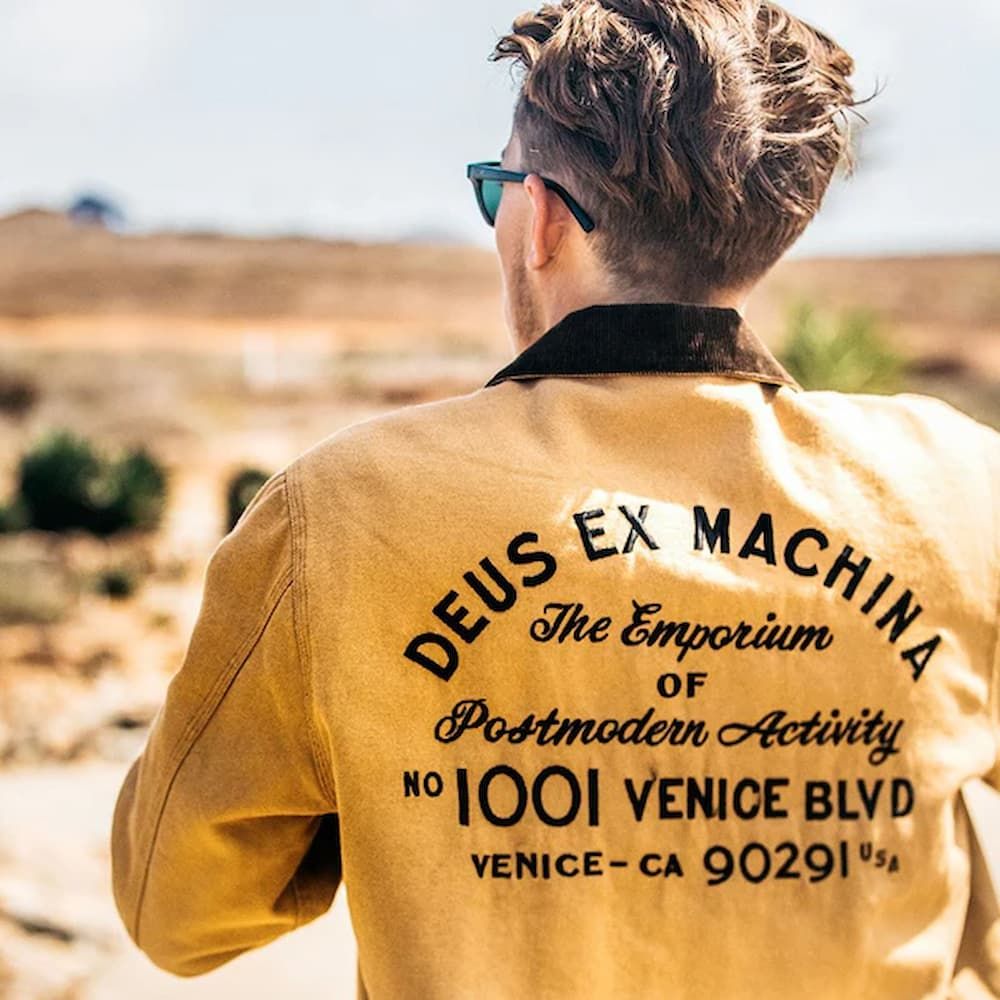 Esta clásica cazadora Workwear para el invierno cuenta con ajuste regular, cálido forro interior de lana tipo manta, cuello de pana, cierre frontal de cremallera completa, un bolsillo en el pecho, dos bolsillos laterales, puños y cintura ajustables con botones a presión, bordado Deus Ex Machina en el lado izquierdo del pecho y la inscripción "Deus Ex Machina. The Emporium of Postmodern Activity. No 1001 Venice BLVD. Venice-Ca 90291. USA" bordada en la espalda.