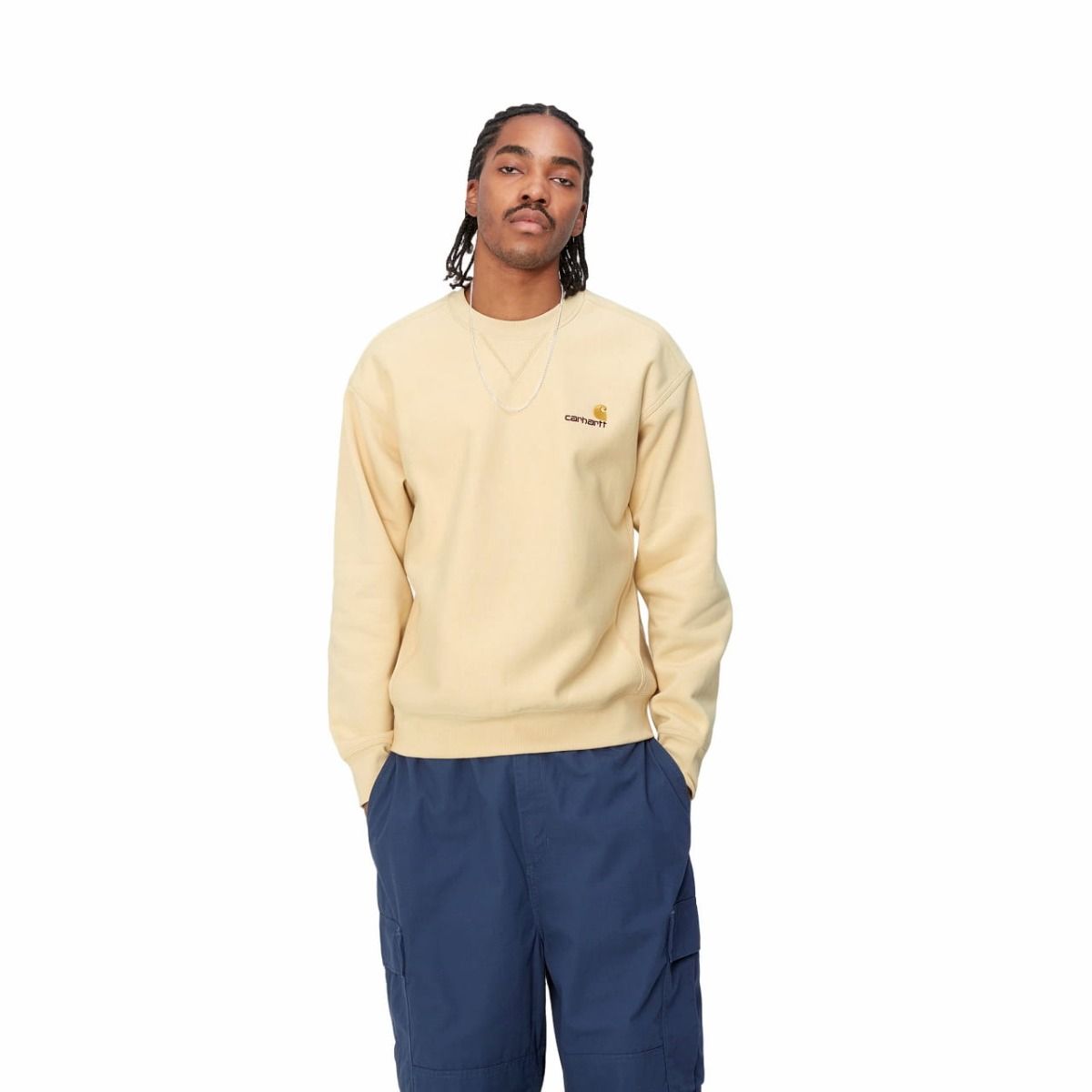 La sudadera para hombre American Script Sweatshirt en tono amarillo (Rattan) de Carhartt WIP está fabricada con 80% algodón y 20% poliéster.