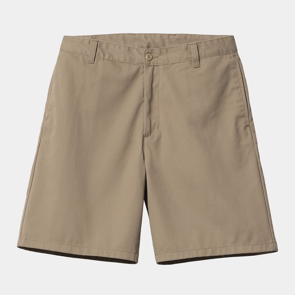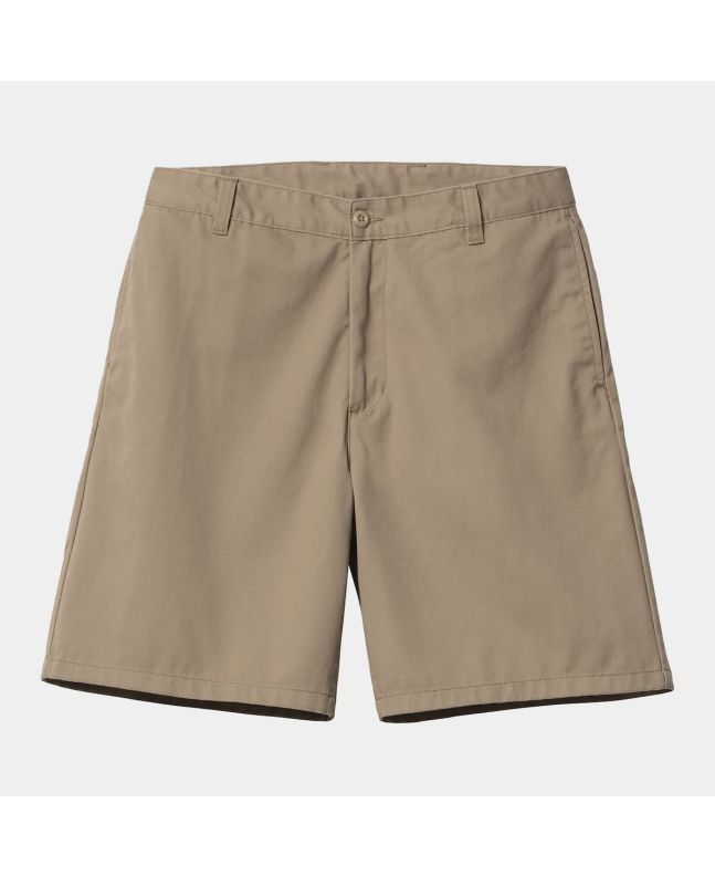 El pantalón corto de estilo chino para hombre Calder Short beige (Leather Rinsed) de Carhartt WIP está confeccionado con sarga Jefferson de 65% algodón y 35% poliéster de peso medio.