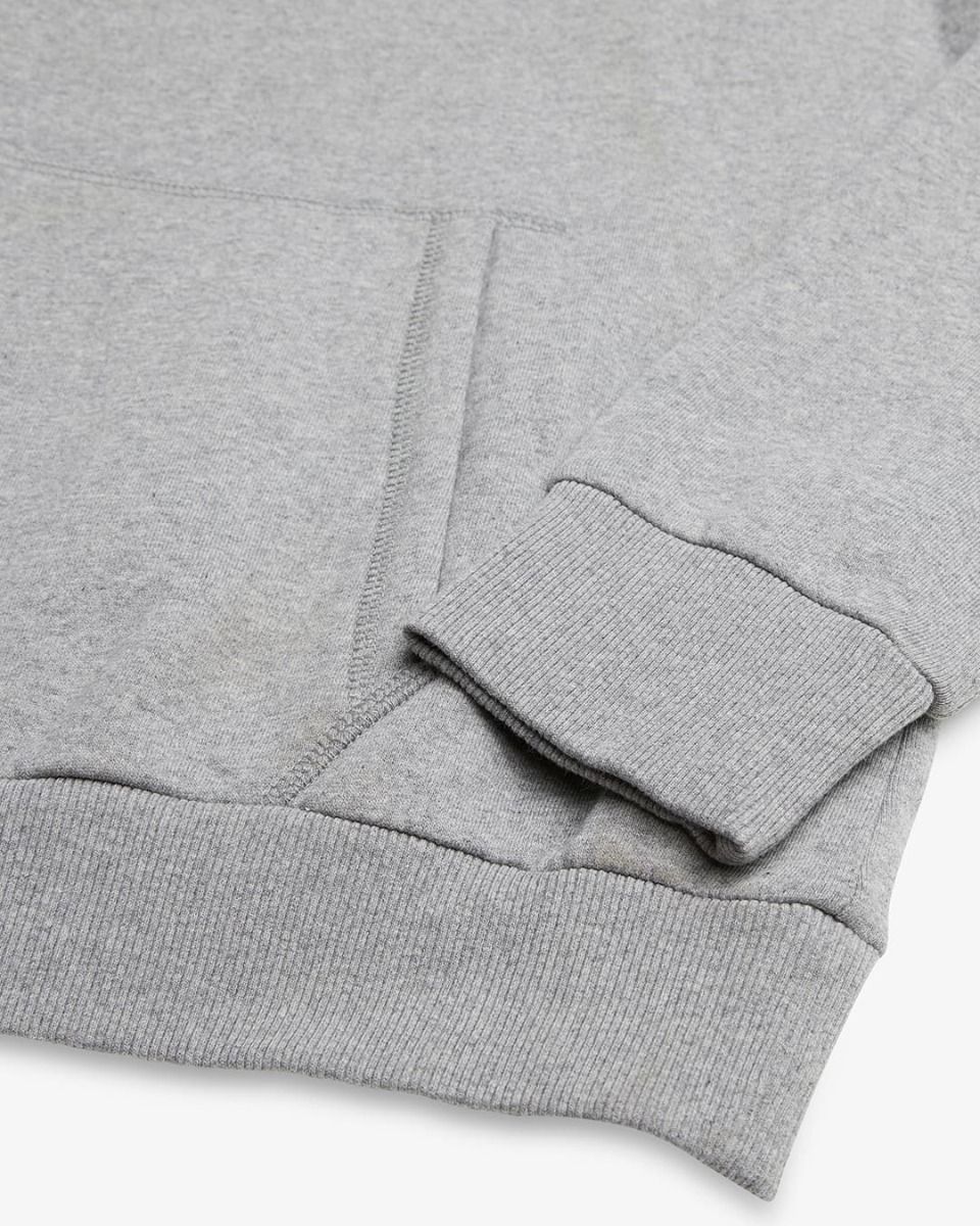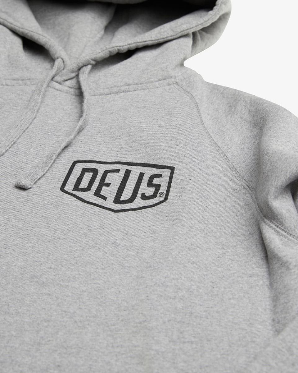 La sudadera con capucha Biarritz Address gris tiene una etiqueta de garantía de Deus cosida en el cuello interior.