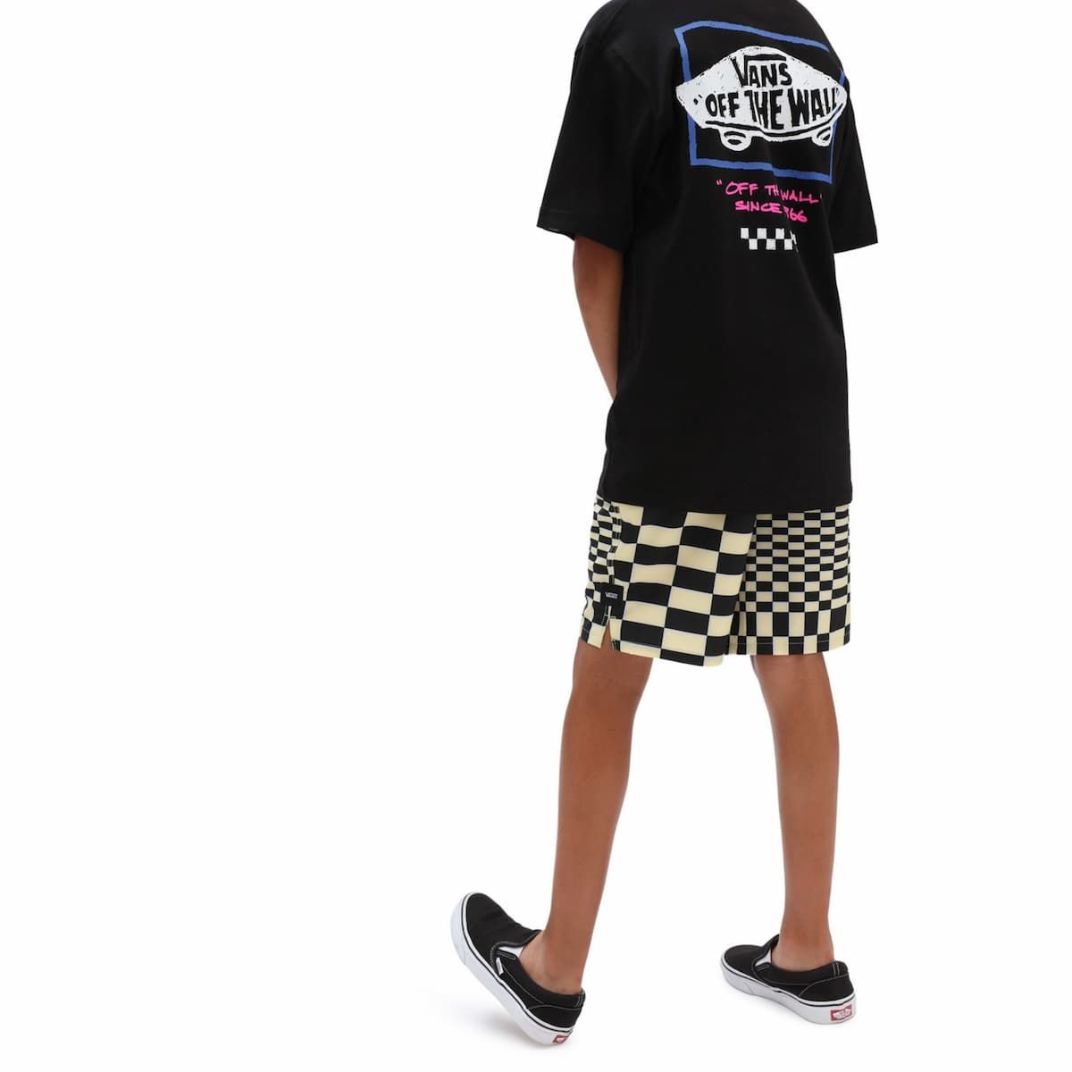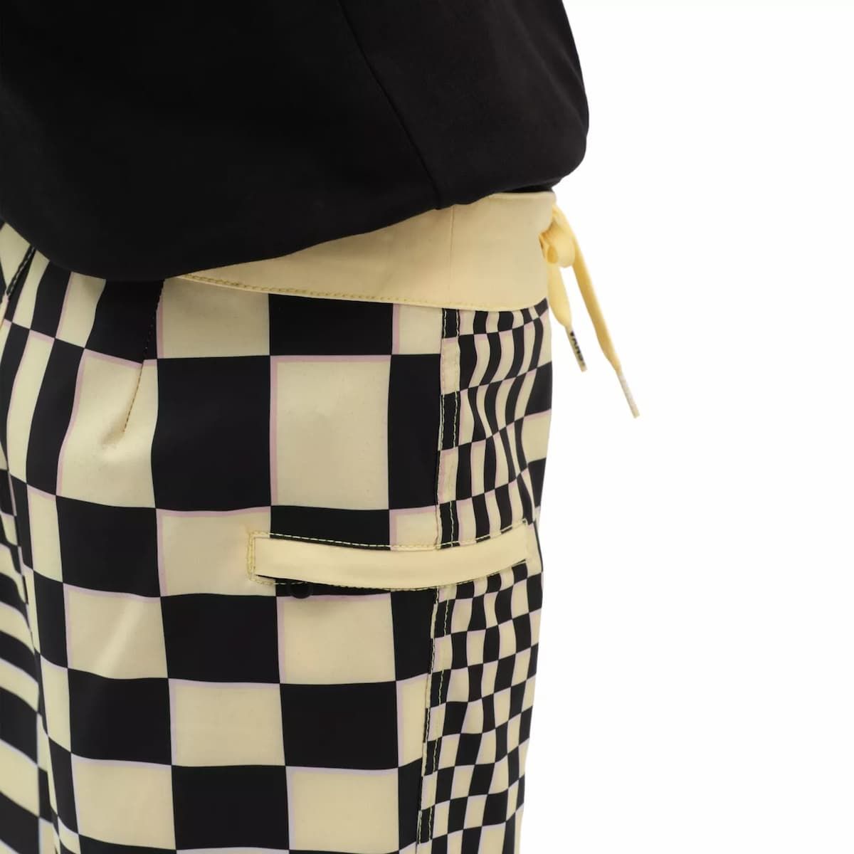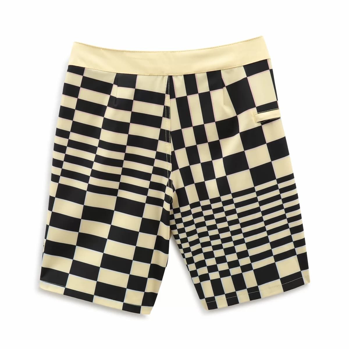 El bañador Skewed Checkerboard amarillo para niño tiene una etiqueta de Vans tejida en la pierna izquierda.