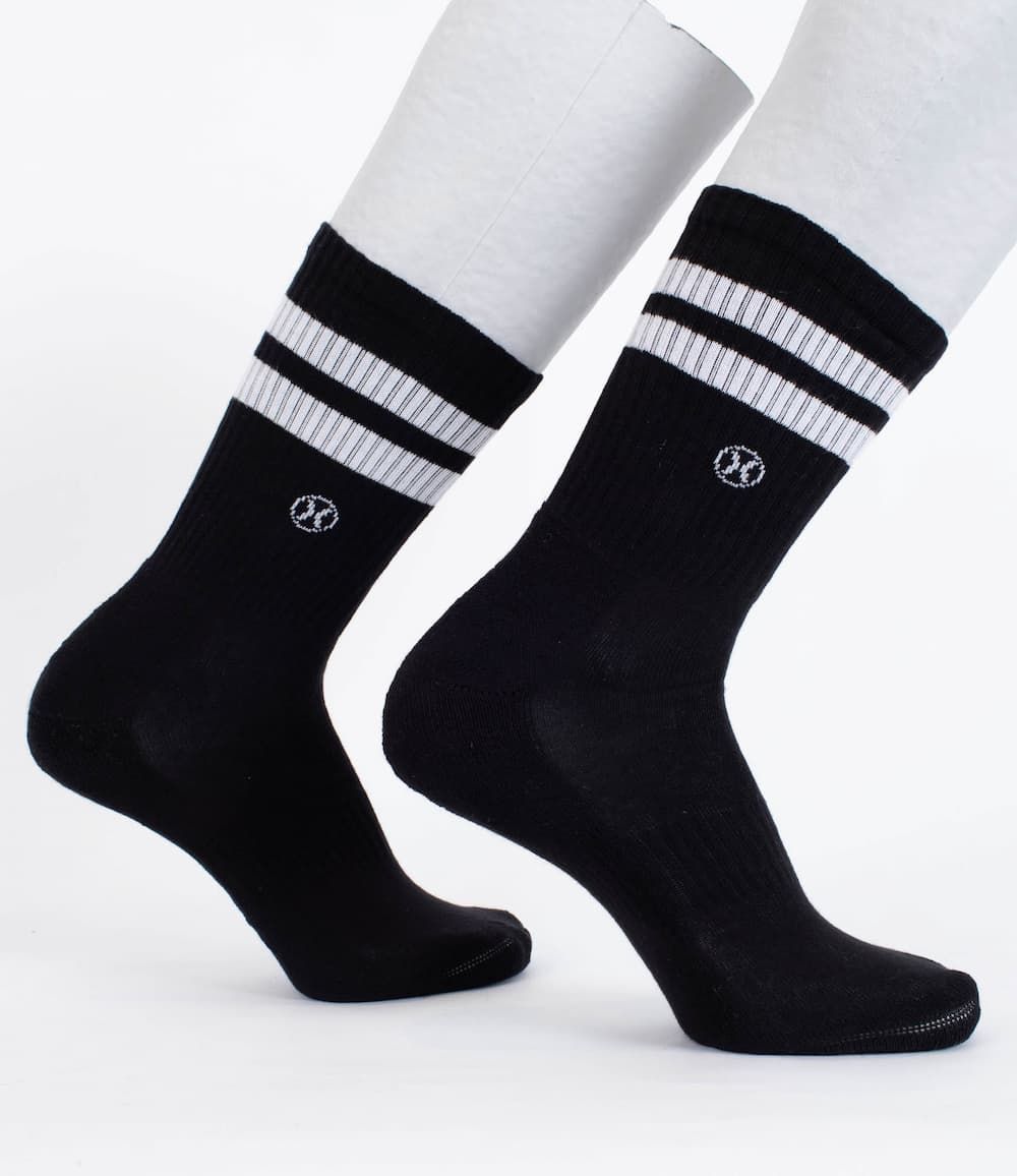 El corte a un cuarto de caña y su confección en canalé elástico permiten un ajuste firme sin apretar. Las dos rayas blancas aportan un guiño retro que remata un look limpio, práctico y cómodo. Ideales para llevar con zapatillas low-top o mid-top, y lo bastante cómodos para usarlos durante todo el día.