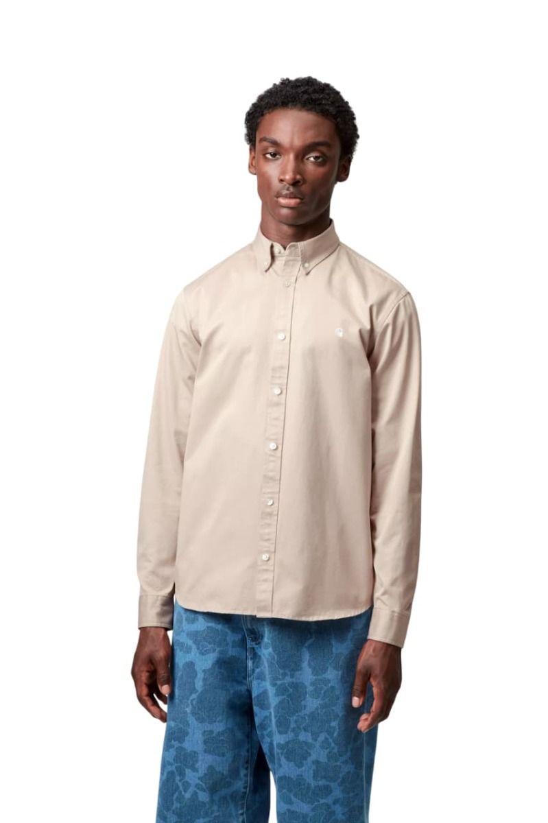 Camisa Carhartt WIP Madison Beige con logo blanco de sarga lavada con corte regular, logo bordado y acabados cuidados.