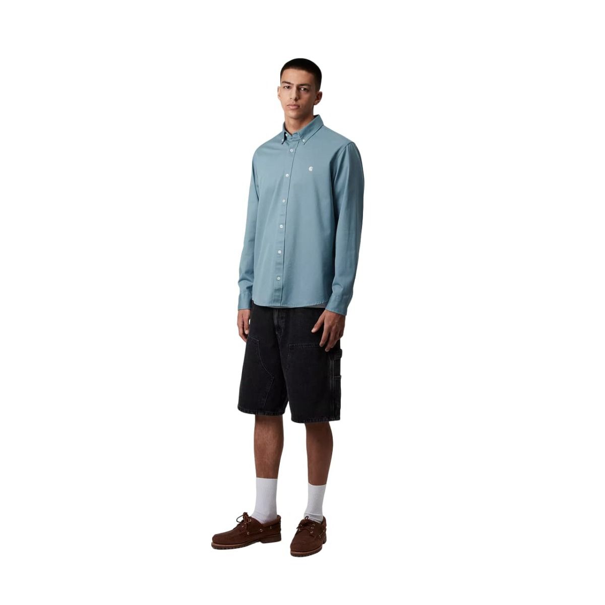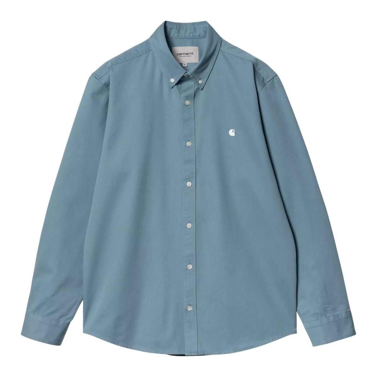 La Madison LS Shirt de Carhartt WIP en tono azul gélido con el logo bordado en color blanco cera (Icy Water-Wax) es una camisa de manga larga con un diseño atemporal y versátil, perfecta para cualquier ocasión. Confeccionada en 100% sarga de algodón de peso medio (6,3 oz), ofrece una combinación ideal de comodidad y resistencia.