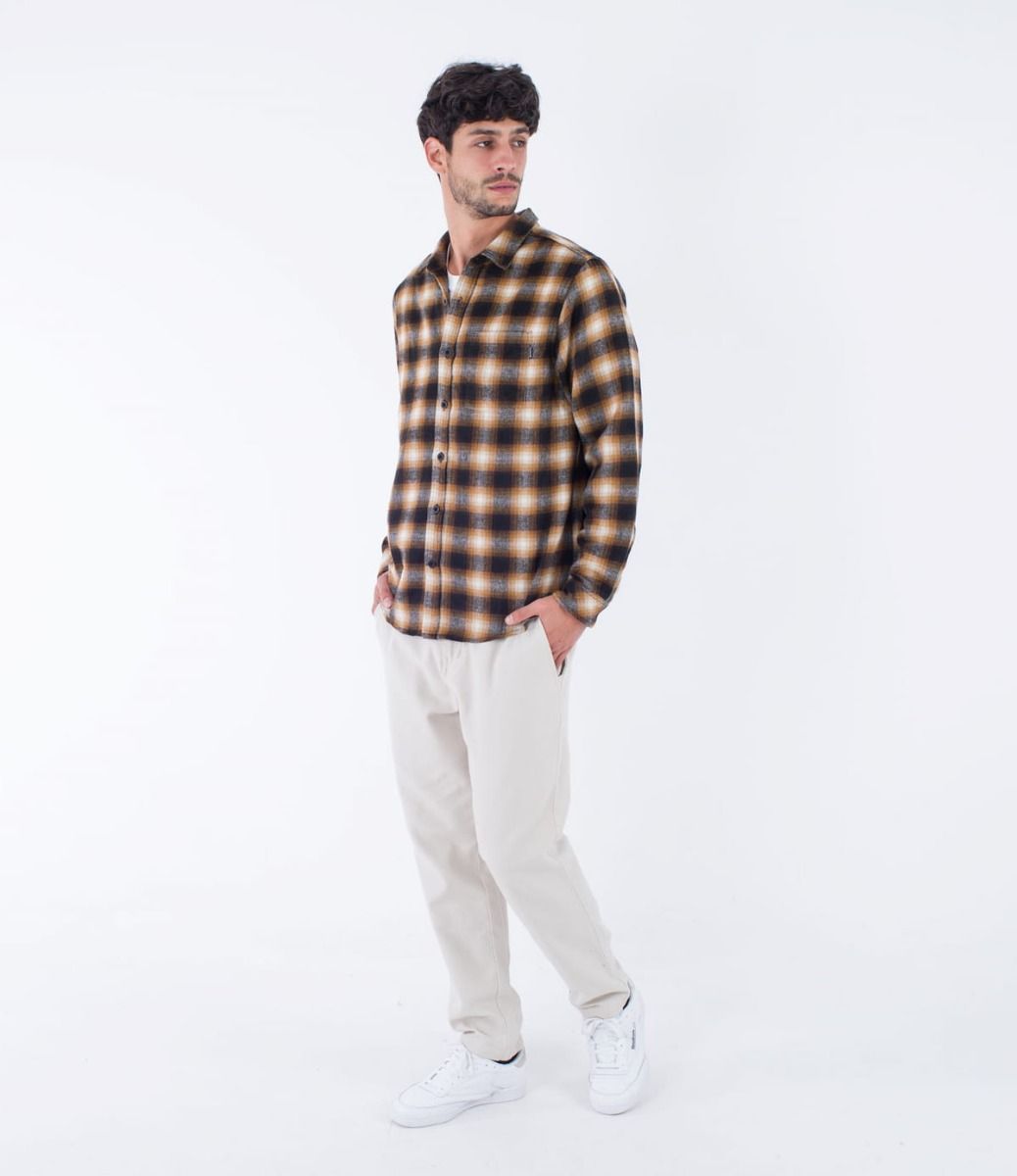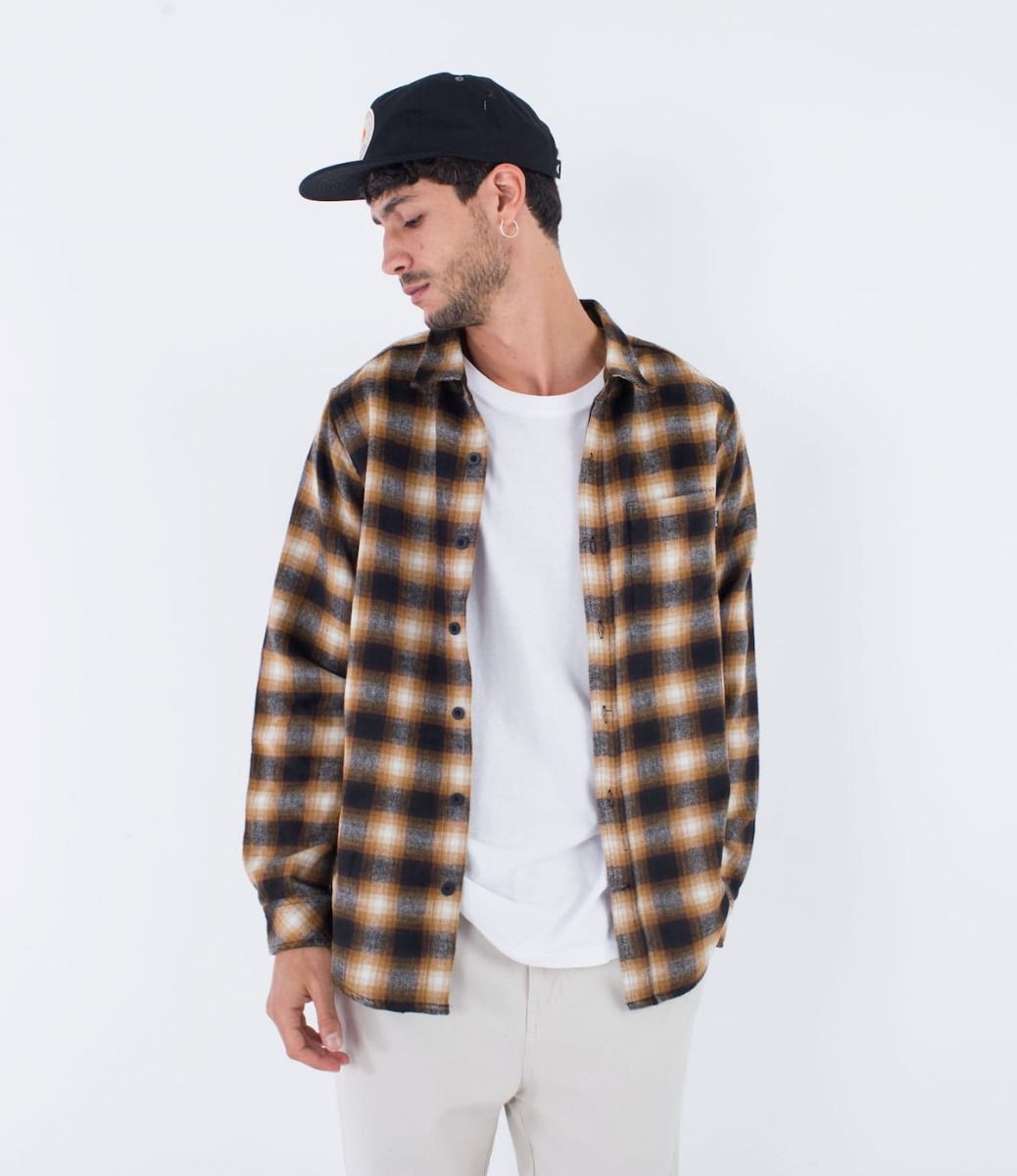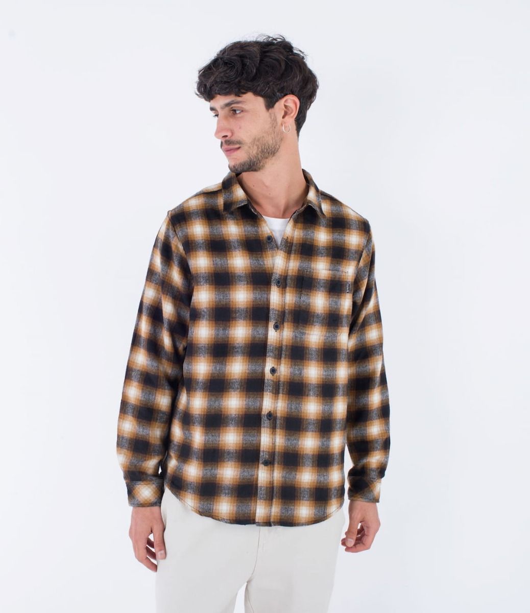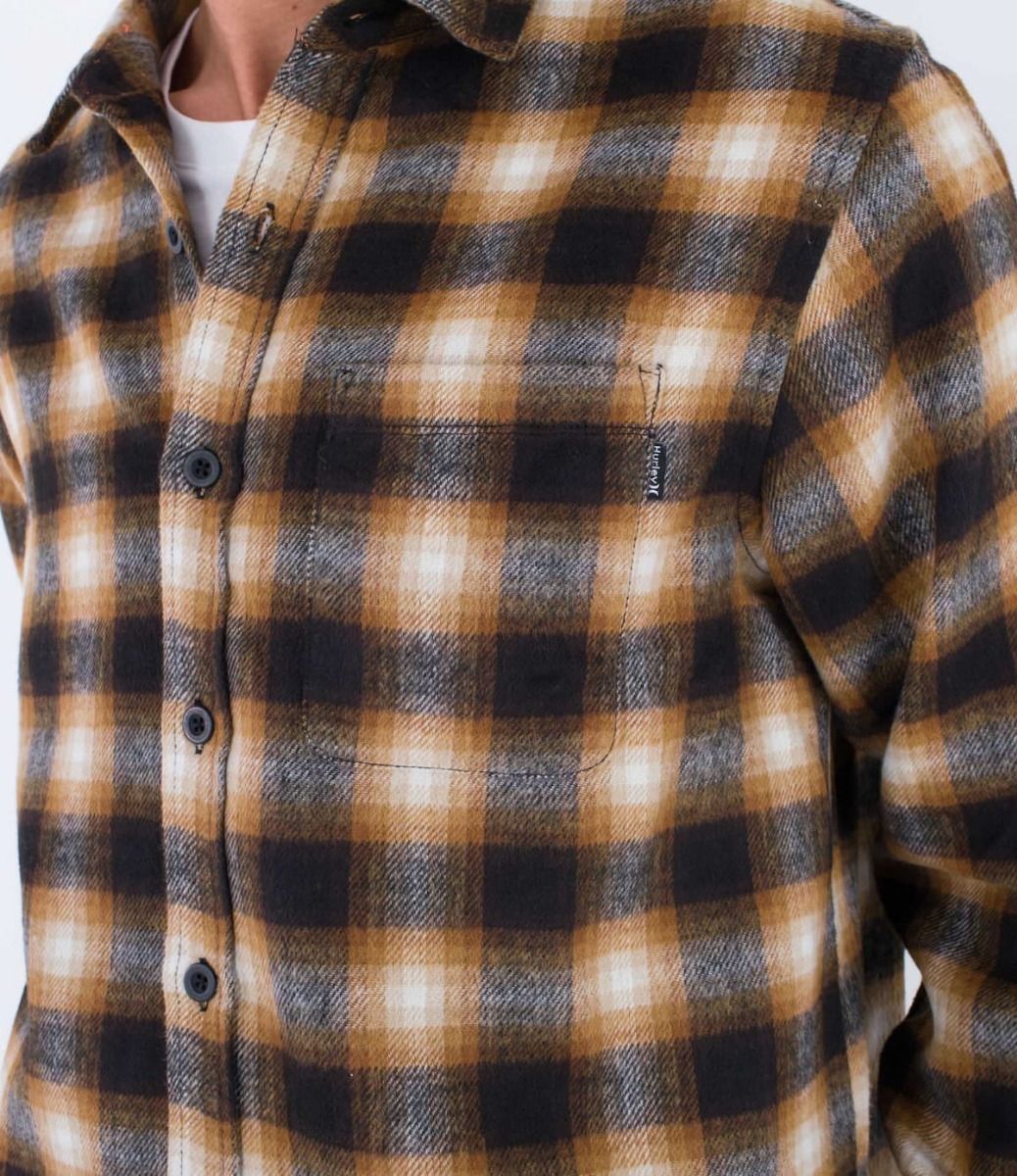 Esta camisa de franela marrón cuenta con manga larga, estampado a cuadros, cierre clásico de botones de poly reciclado, un bolsillo de parche en el pecho, dobladillo inferior festoneado, pliegues en el canesú posterior y una etiqueta de Hurley One and Only tejida en el bolsillo del pecho.