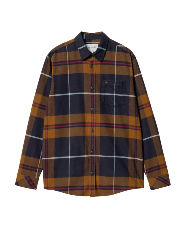 Esta camisa de franela, ideal para el invierno, cuenta con ajuste holgado, estampado a cuadros integral, manga larga, cierre clásico de botonadura, dobladillo curvado, lavado en prenda, hilo teñido y un bolsillo con el logotipo de la "C" de Carhartt WIP bordado.