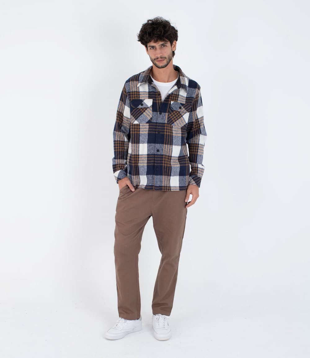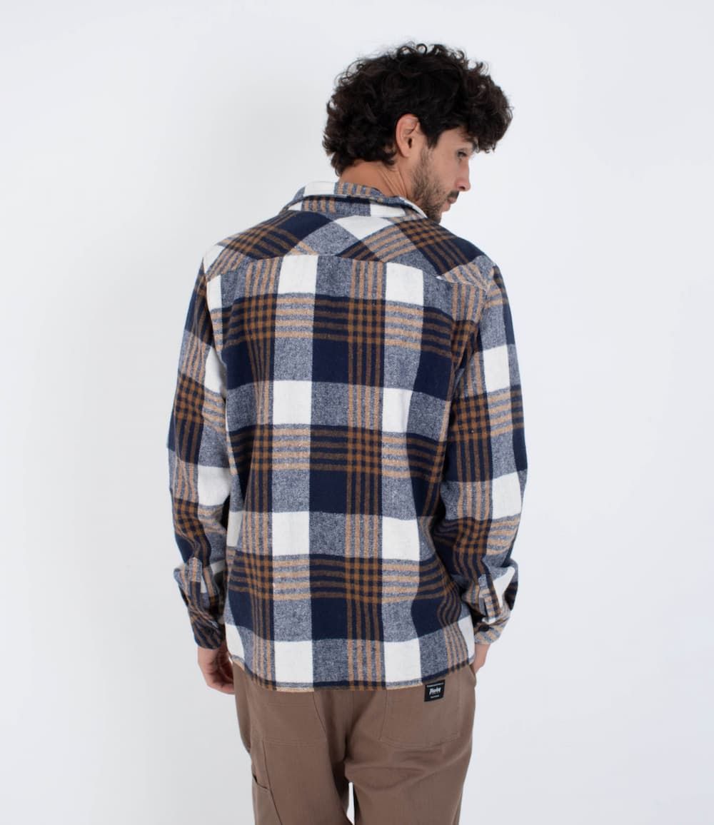 Diseñada para climas fríos y aventuras cotidianas, la Hurley Ranger Flannel Shirt en color azul marino (Nightforce) es una camisa de franela gruesa que combina la funcionalidad del mundo outdoor con la estética urbana. Su patrón de cuadros clásicos en tonos azul, blanco y marrón añade un toque atemporal que funciona igual de bien en escapadas al campo o en el día a día en la ciudad.
