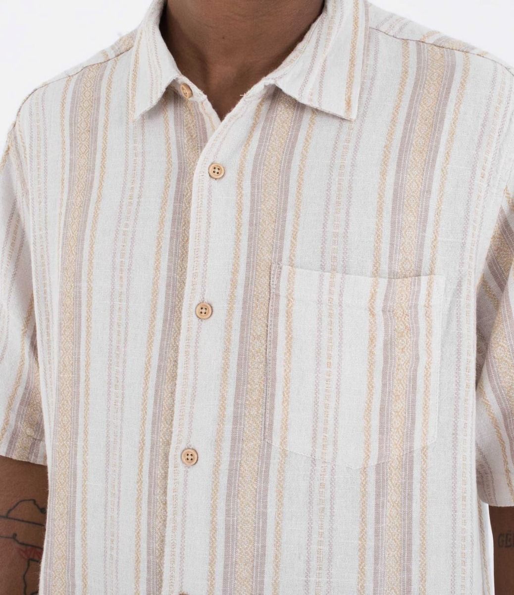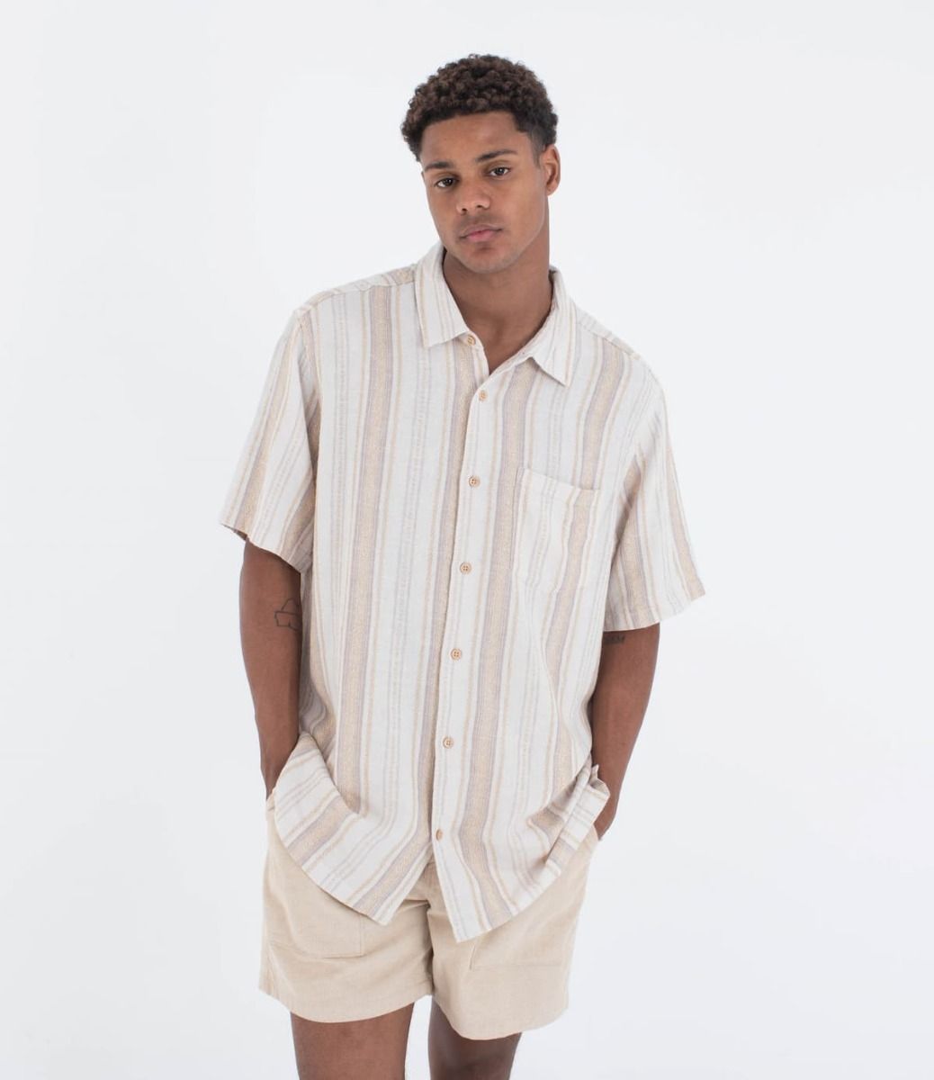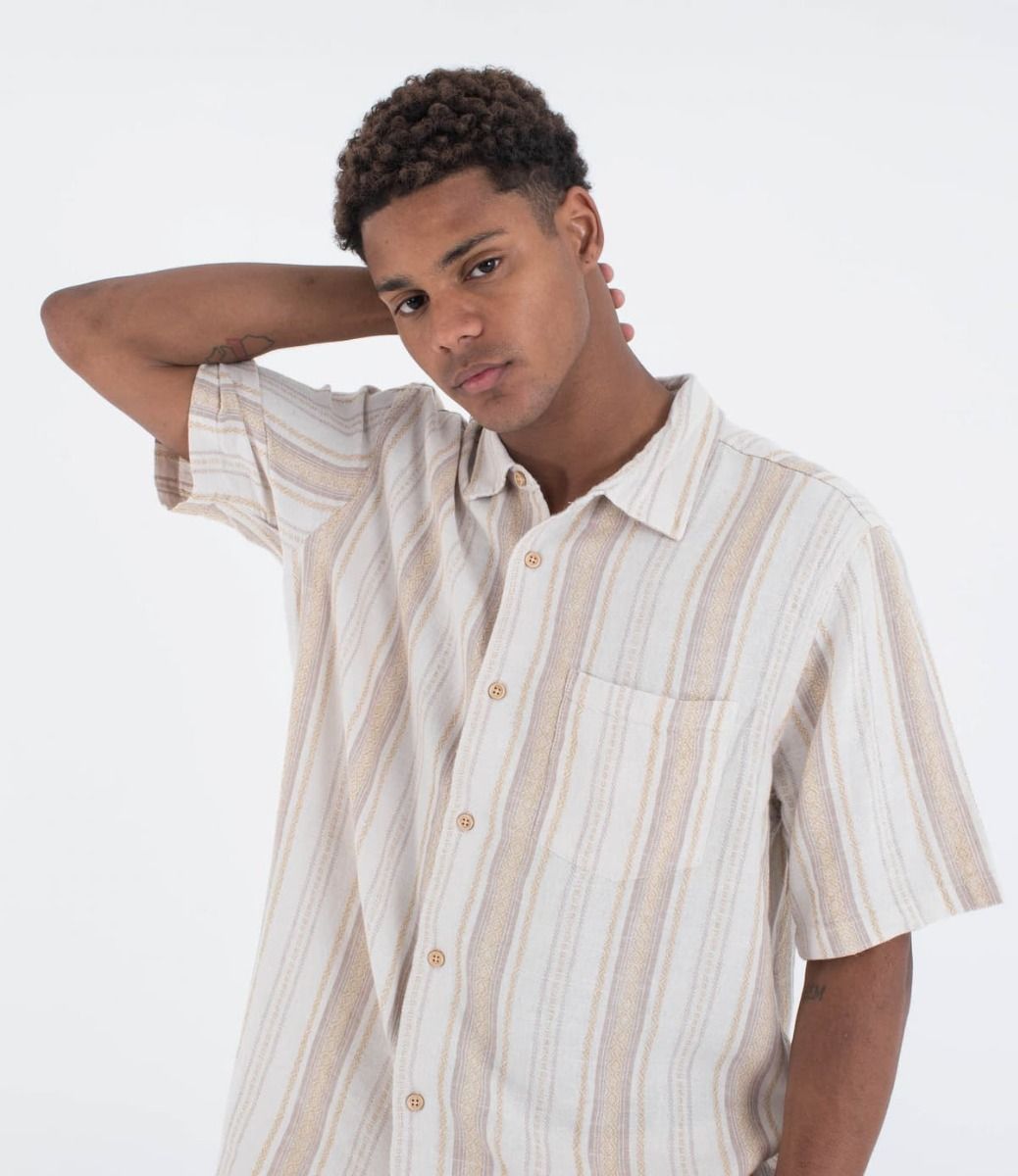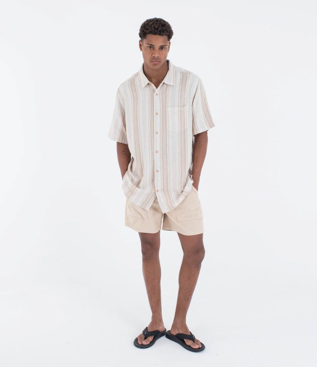 La camisa para hombre Barely Bone Short Sleeve Shirt en tono blanco hueso a rayas (Barely Bone) de Hurley está confeccionada en un tejido en mezcla de 51% lino y 49% rayón, lo que te garantiza frescura y comodidad en los días más cálidos.
