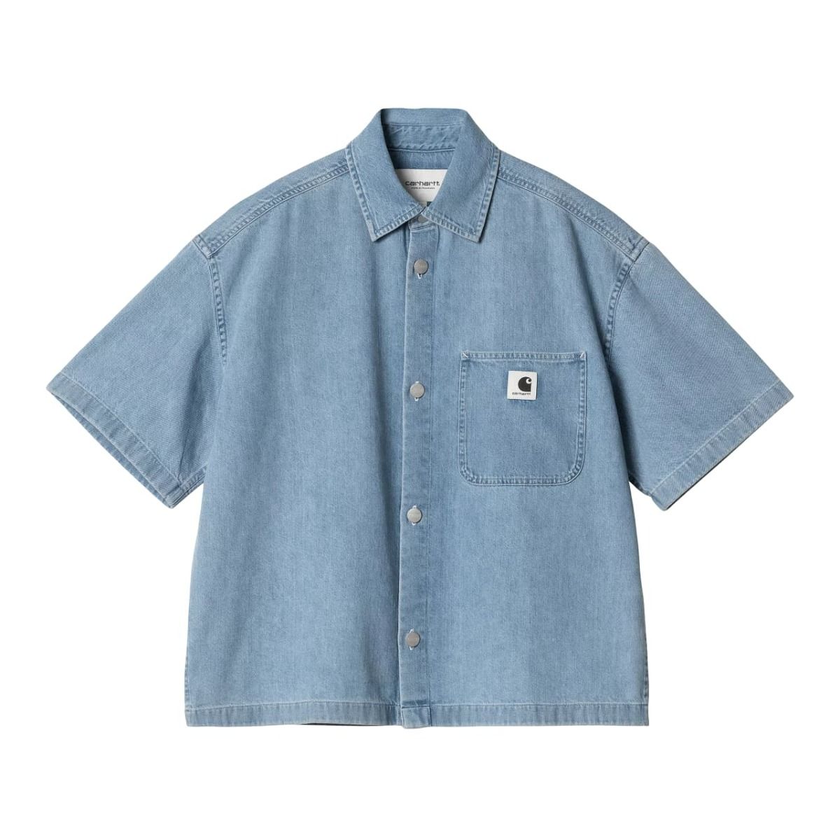 La camisa de manga corta para mujer S/S Lovilia Shirt en tono azul blanqueado (Blue-Bleached) de Carhartt WIP está confeccionada con tejido Denim de 100% algodón de peso medio (8,5oz).