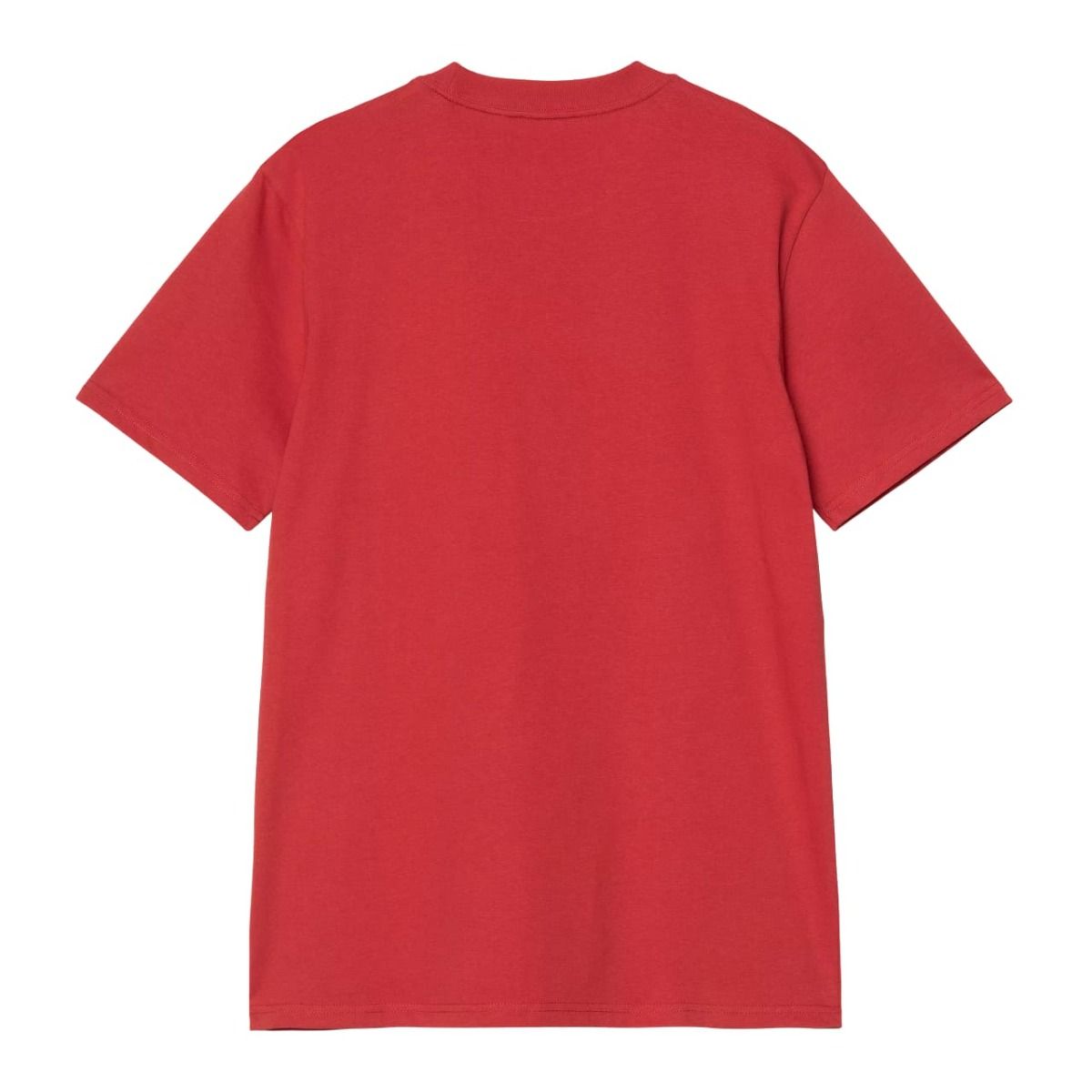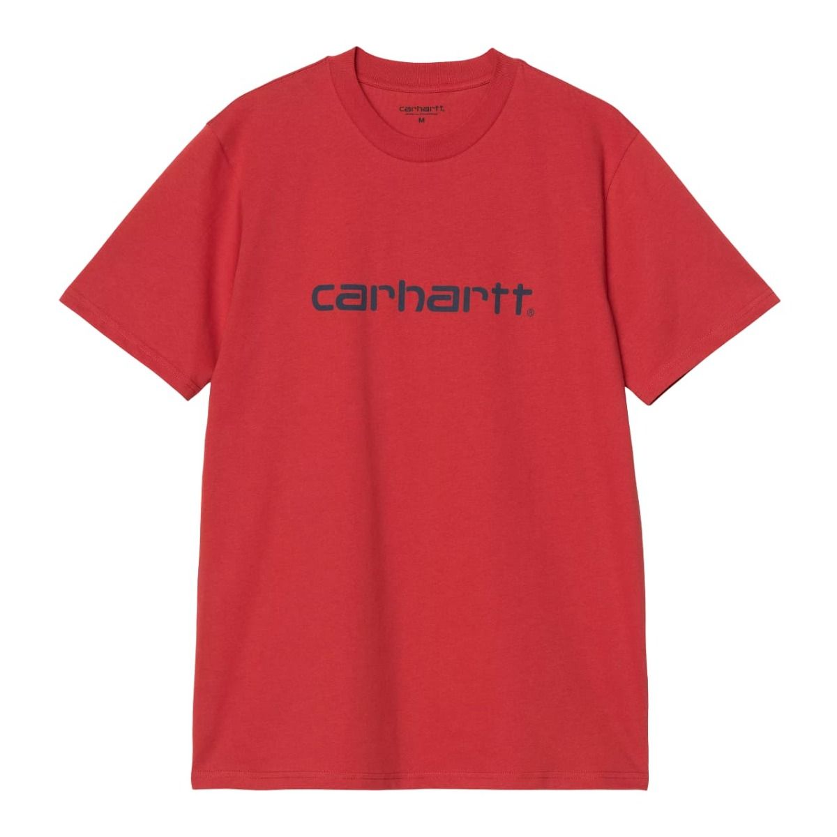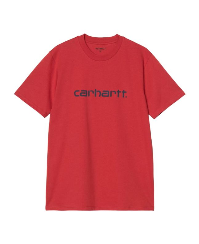 Esta camiseta clásica color rojo cereza (Cherry) de ajuste regular para hombre cuenta con cuello redondo, manga corta y el logo en texto de Carhartt impreso en color azul espacial (Space) en la parte delantera.