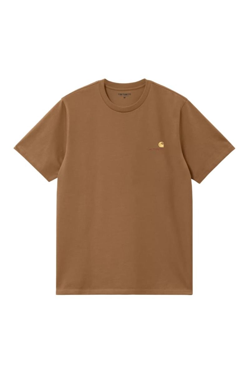 Camiseta Carhartt WIP American Script en color marrón Hamilton Brown. Confeccionada en algodón orgánico grueso con logo bordado y corte holgado.