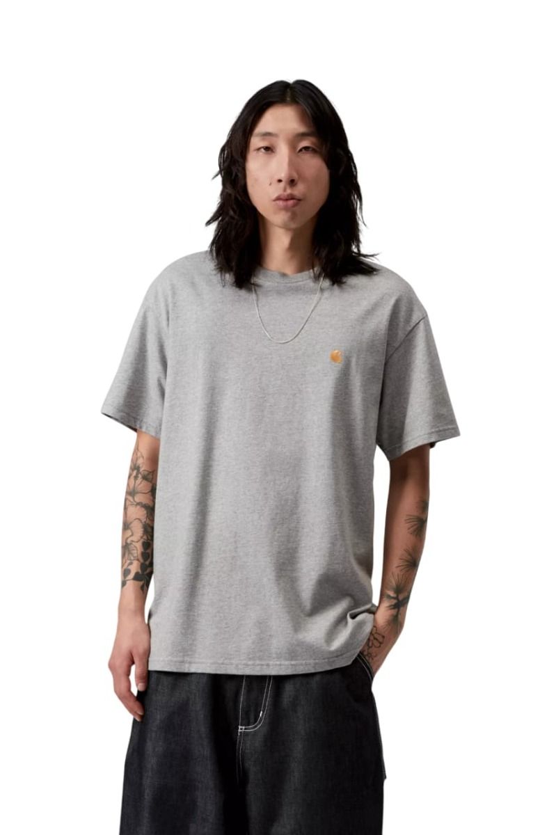 Camiseta Carhartt WIP Chase para hombre en Grey Heather/Gold con algodón peinado 235g/m², ajuste holgado y logo bordado.