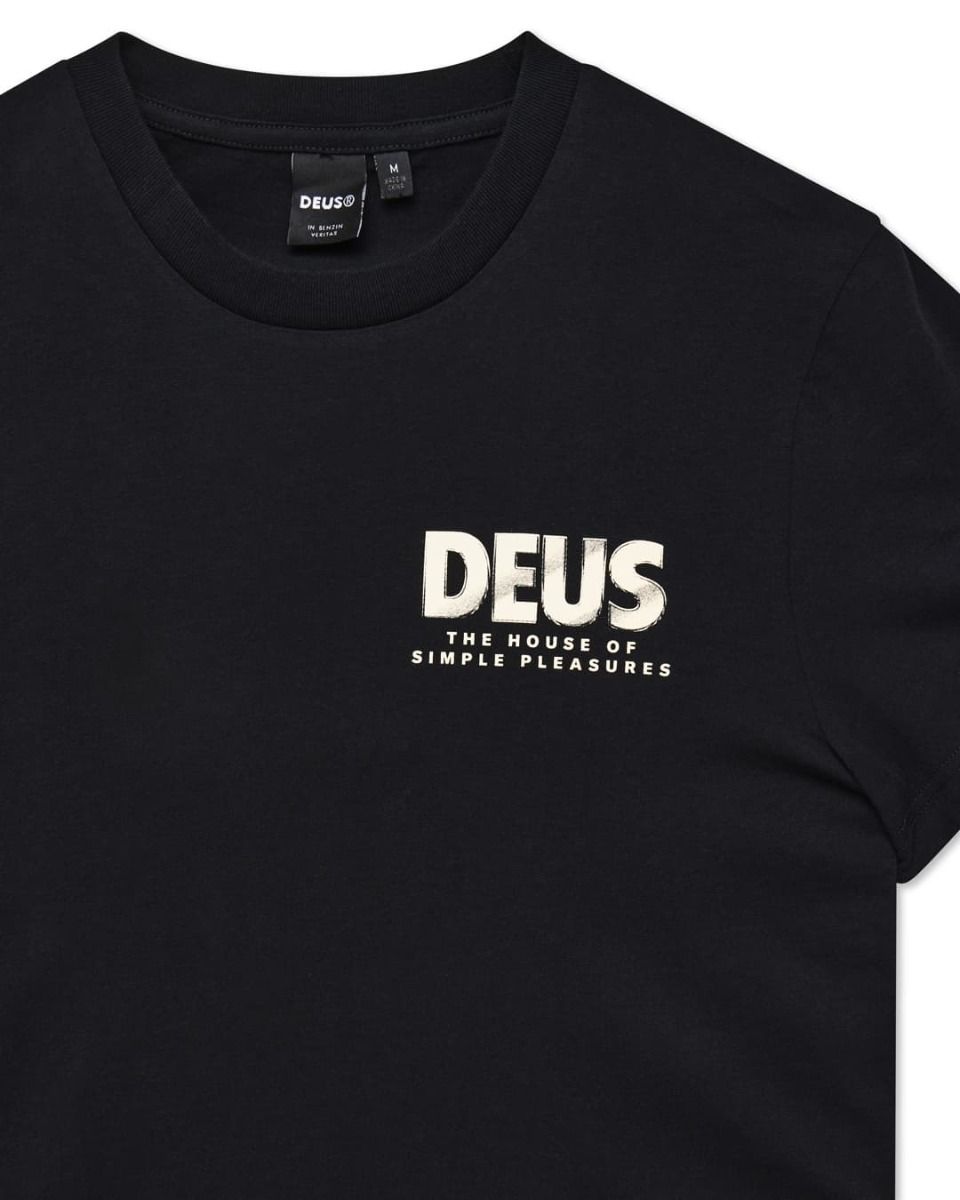 Diseño gráfico contundente, sin concesiones: el icónico logotipo "DEUS – The House of Simple Pleasures" aparece en el pecho y en gran tamaño en la espalda, en un print beige de textura retro. Una oda al taller mecánico, al metalworks y a la cultura garage que hizo nacer a Deus.