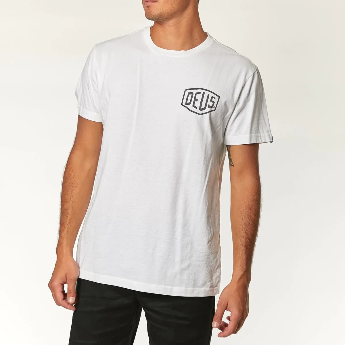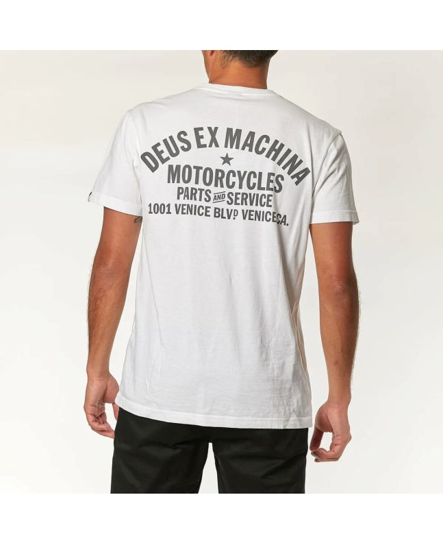 Esta camiseta de ajuste regular, perteneciente a la colección "Deus Ex Machina Classics", cuenta con cuello redondo, manga corta, el logo de Deus estampado en el lado izquierdo del pecho y la leyenda “Deus Ex Machina. Motorcycles. Parts and Service. 1001 Venice BLVD Venice Ca." impresa en la espalda.