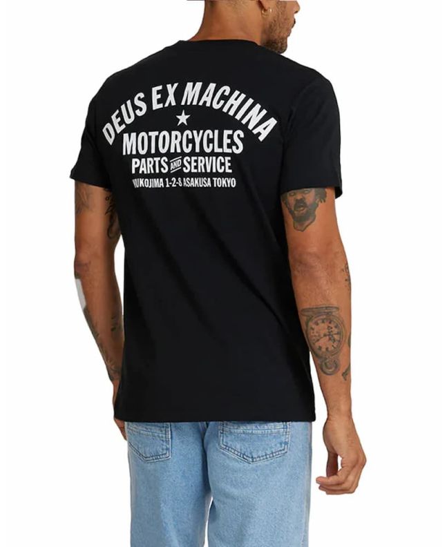 Camiseta negra Deus Tokyo Address para hombre con logos serigrafiados en blanco. 100% algodón, corte estándar, diseño clásico y duradero con esencia japonesa.
