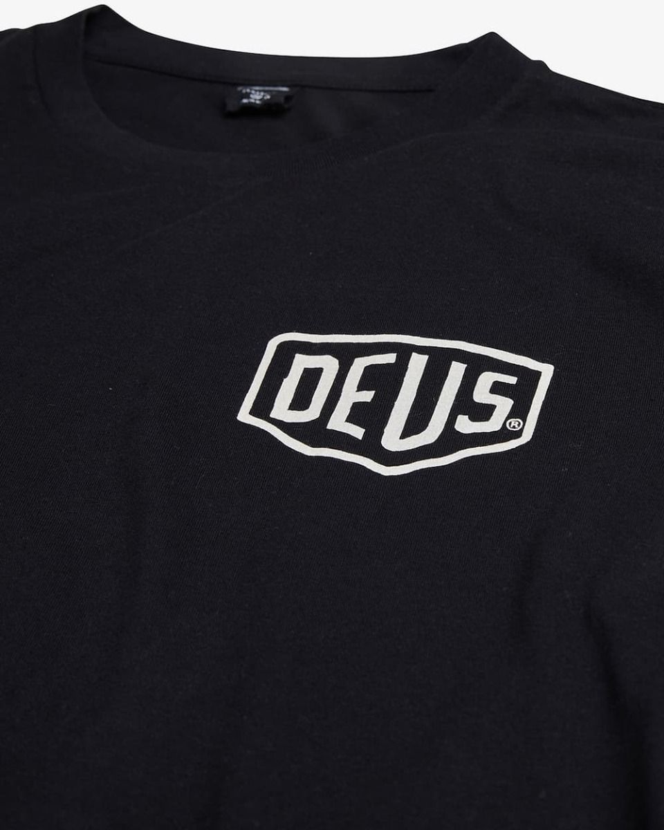 Al frente, el icónico logo escudo DEUS impreso en blanco contrasta sobre el negro puro de fondo. En la espalda, una gráfica envolvente que hace referencia a la tienda Deus de Asakusa, Tokio: "Motorcycles – Parts and Service – Mukojima 1-2-8".