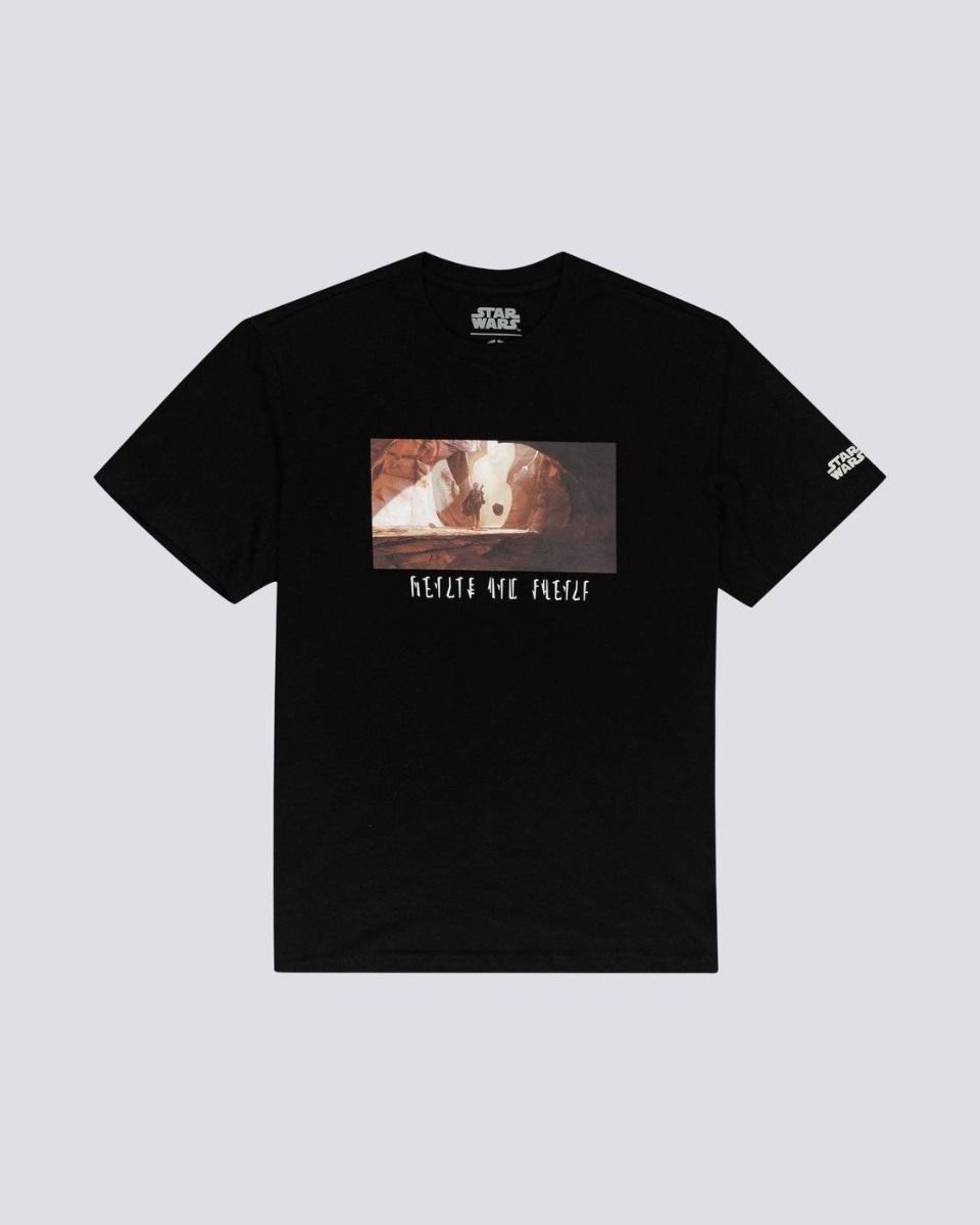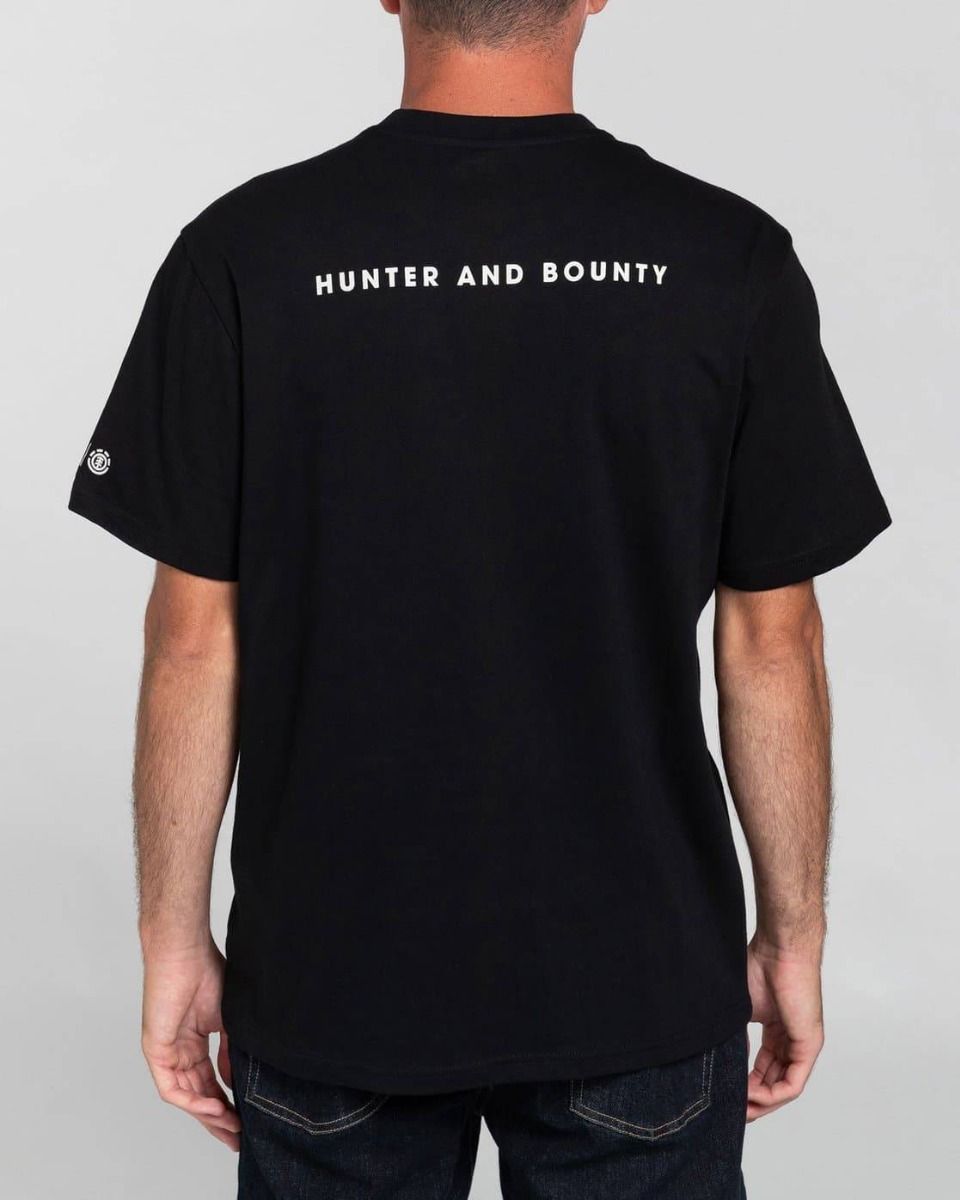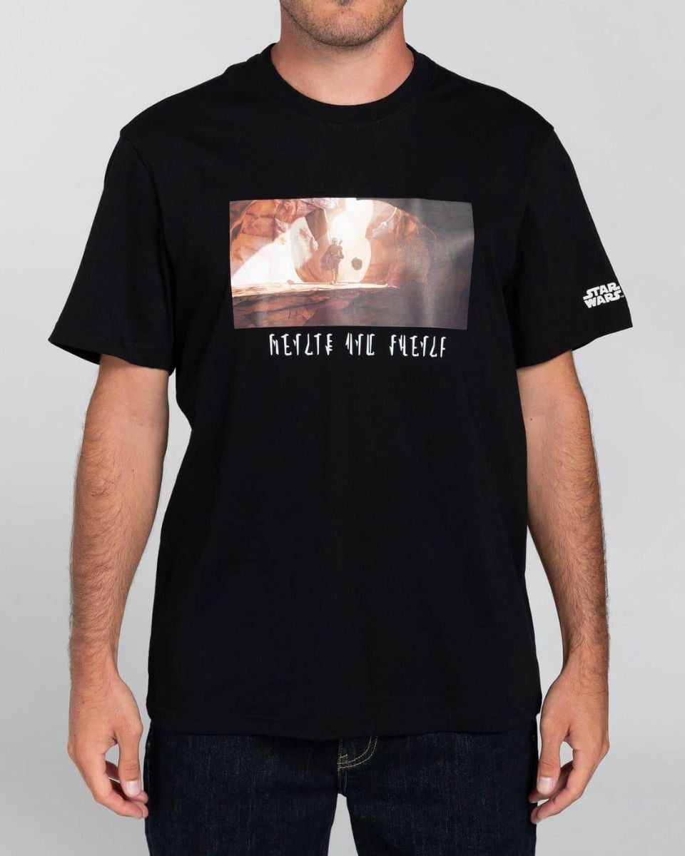 Cuenta con cuello redondo, manga corta, una ilustración exclusiva de The mandalorian y Baby Yoda en el pecho, el logo de Star Wars y Element en las mangas, y la leyenda “Hunter & Bounty” (cazador y recompensa) en la espalda.