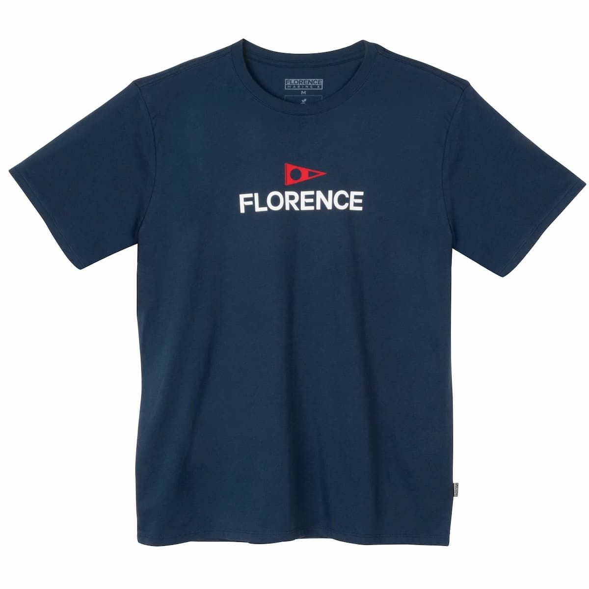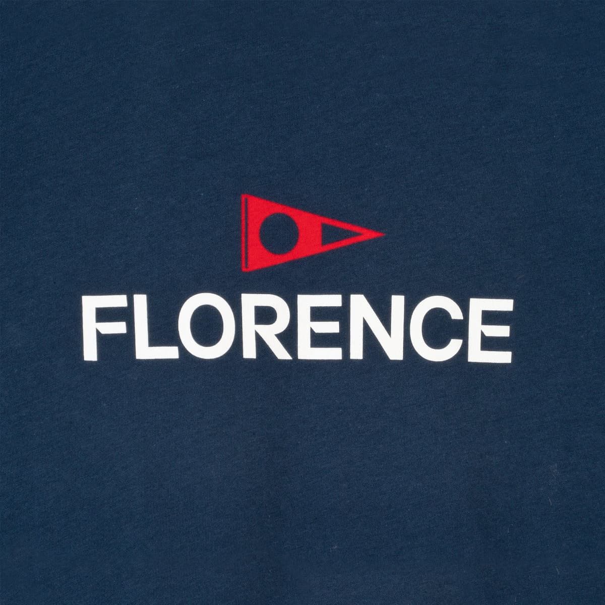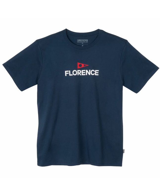 Esta camiseta azul marino de corte normal cuenta con cuello redondo, manga corta y el logo de Florence impreso en la parte delantera.