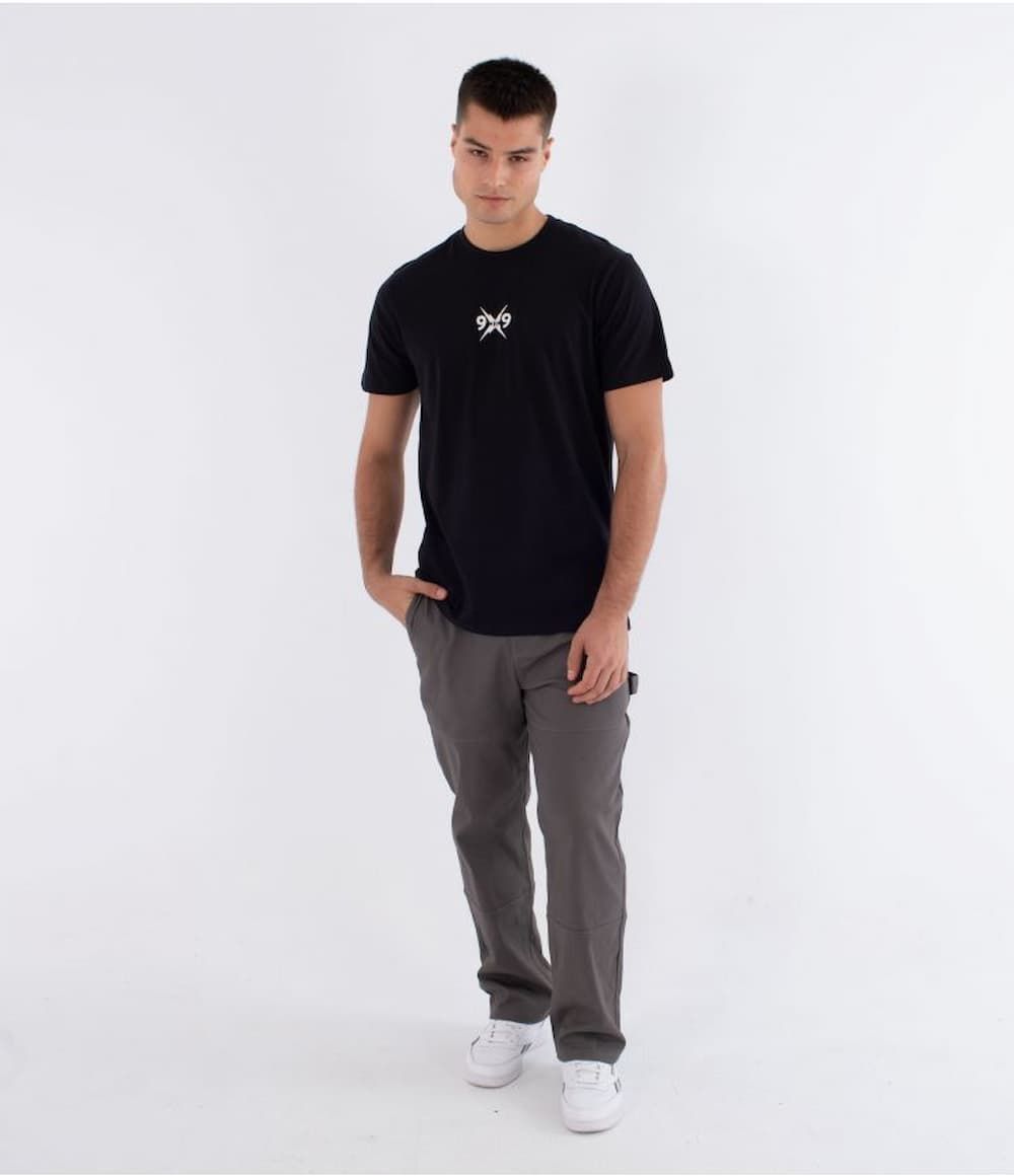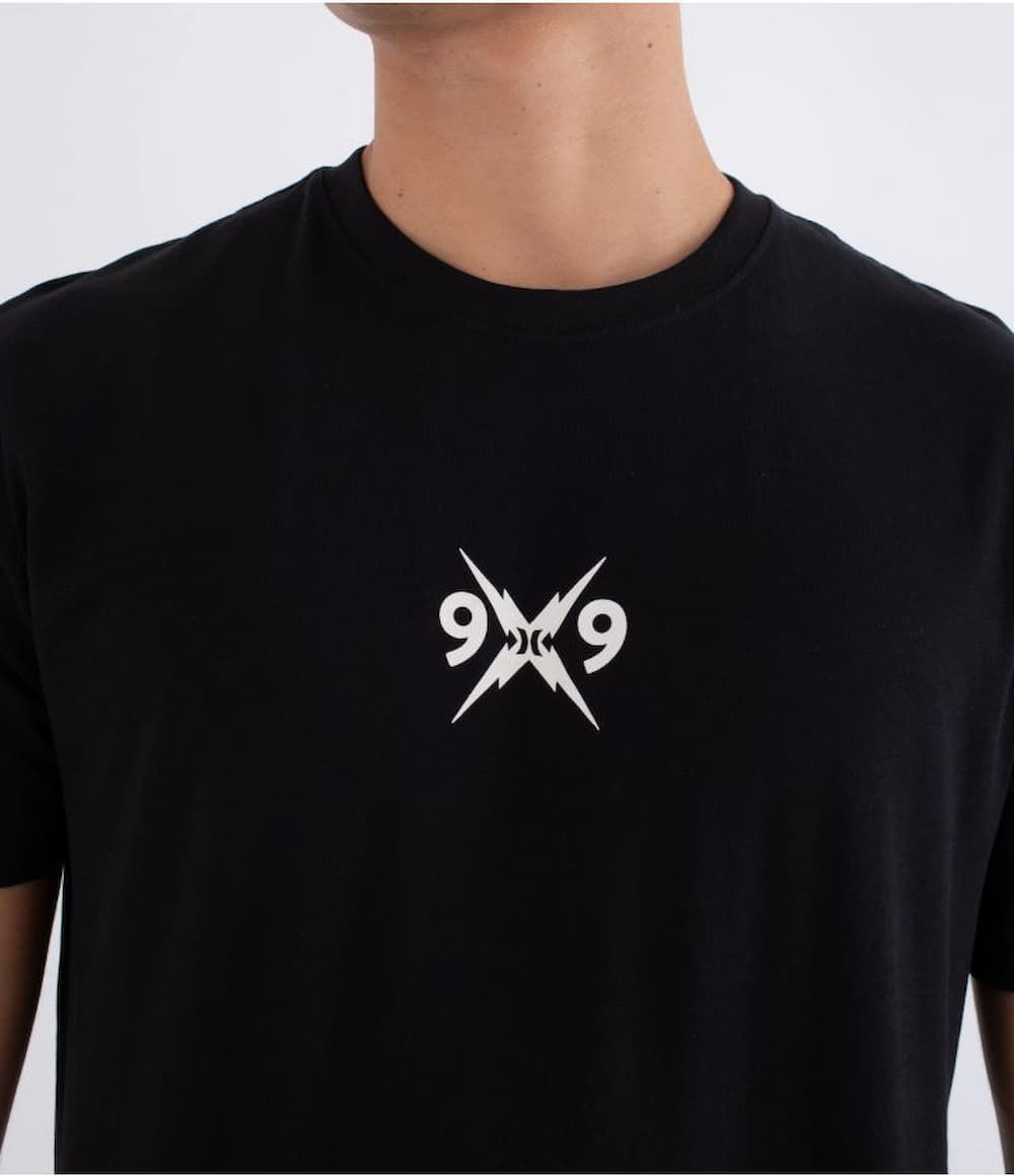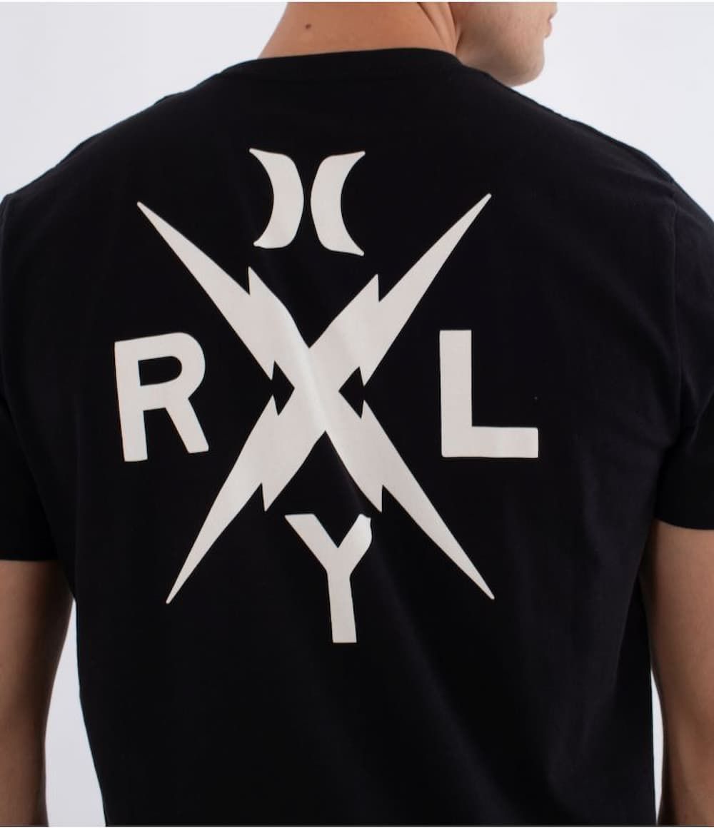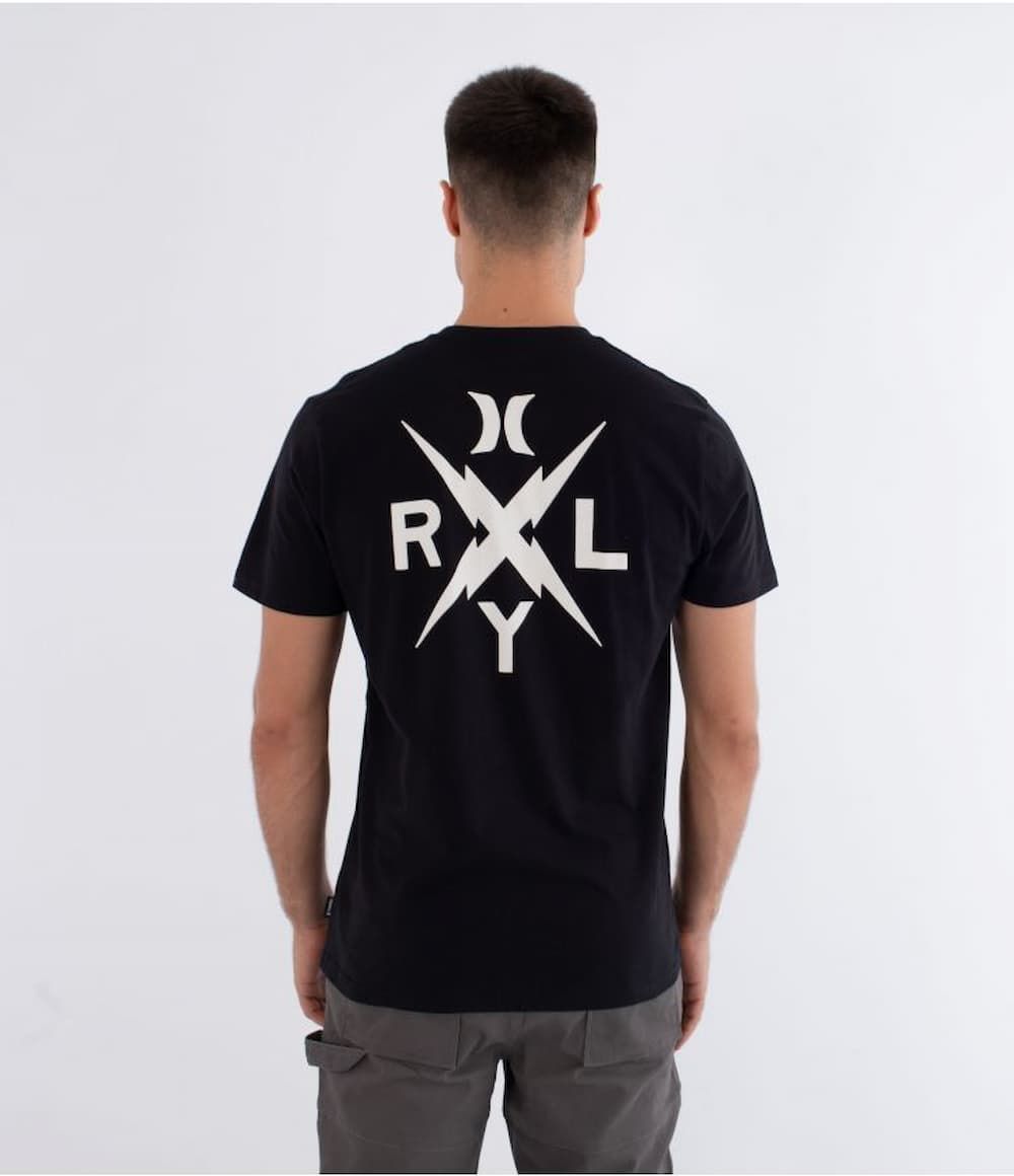 El estampado frontal presenta un diseño minimalista con el logotipo 9x9 al centro del pecho, mientras que en la espalda destaca una composición más potente con relámpagos cruzados y las letras RLY rodeando el icónico símbolo Hurley. Una mezcla visual que destila energía old-school y carácter gráfico.