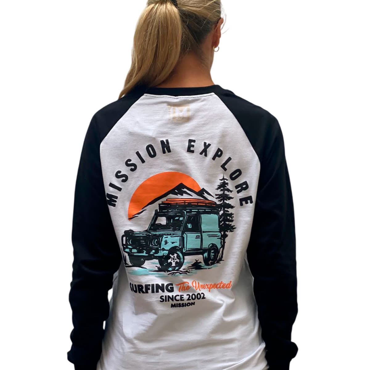Añade un toque aventurero a tu look con la camiseta de manga larga para hombre y mujer Mission LS Ranglan Tee Logo Explore en tono blanco y negro (White-Black).