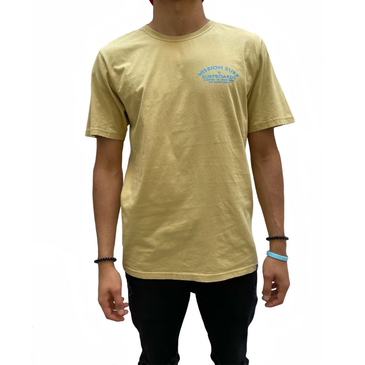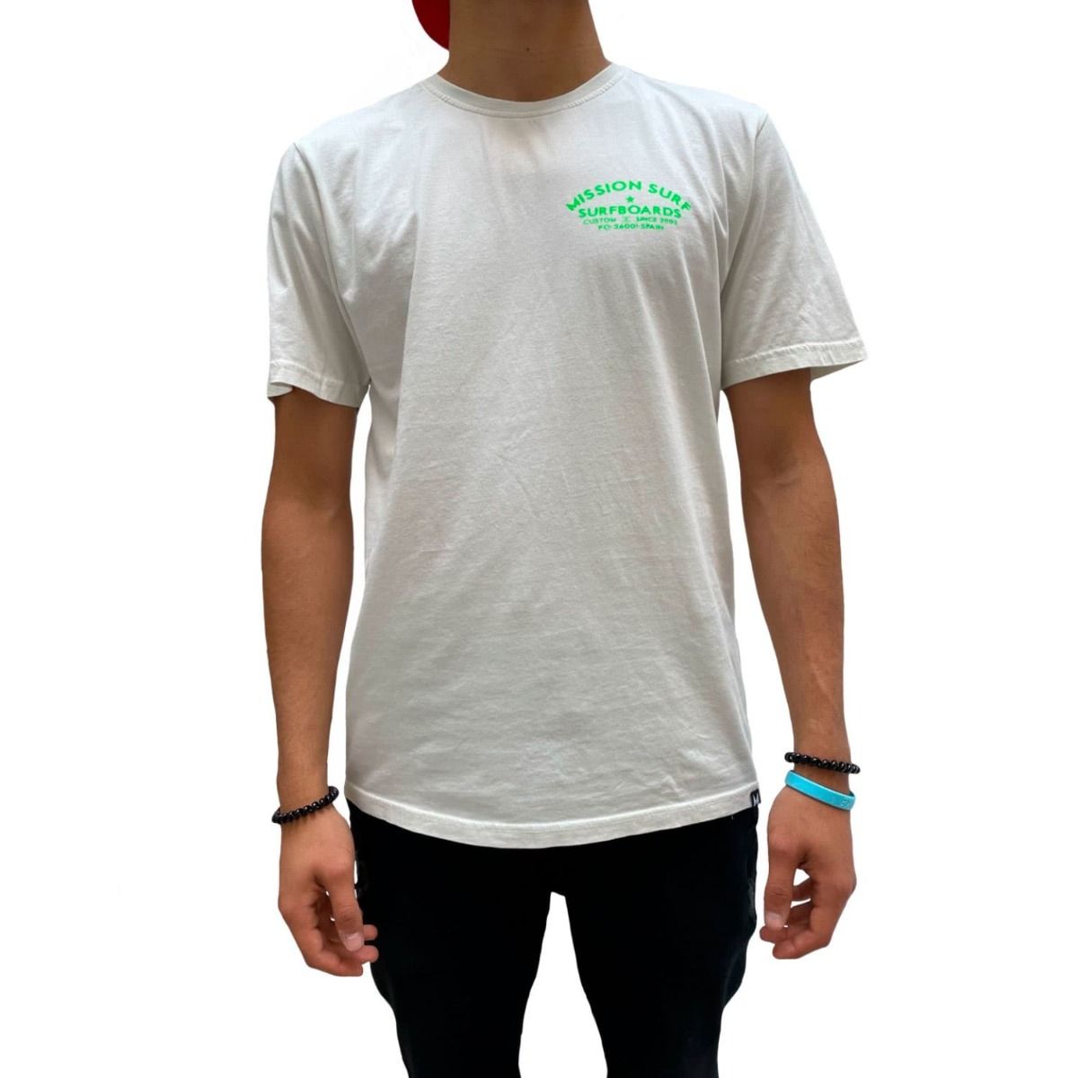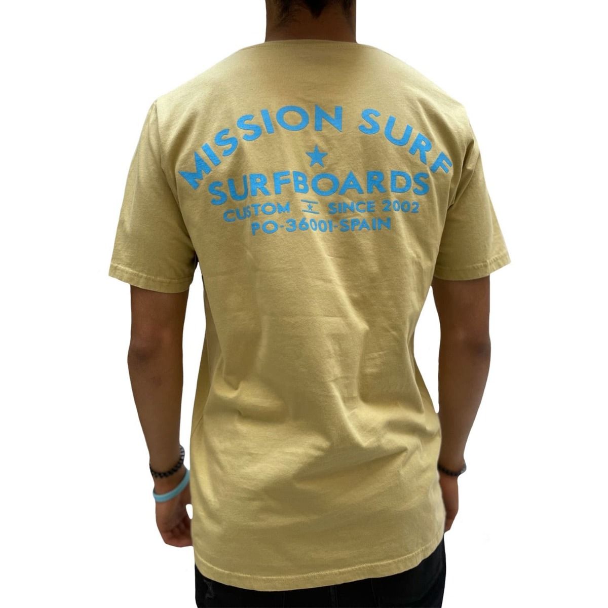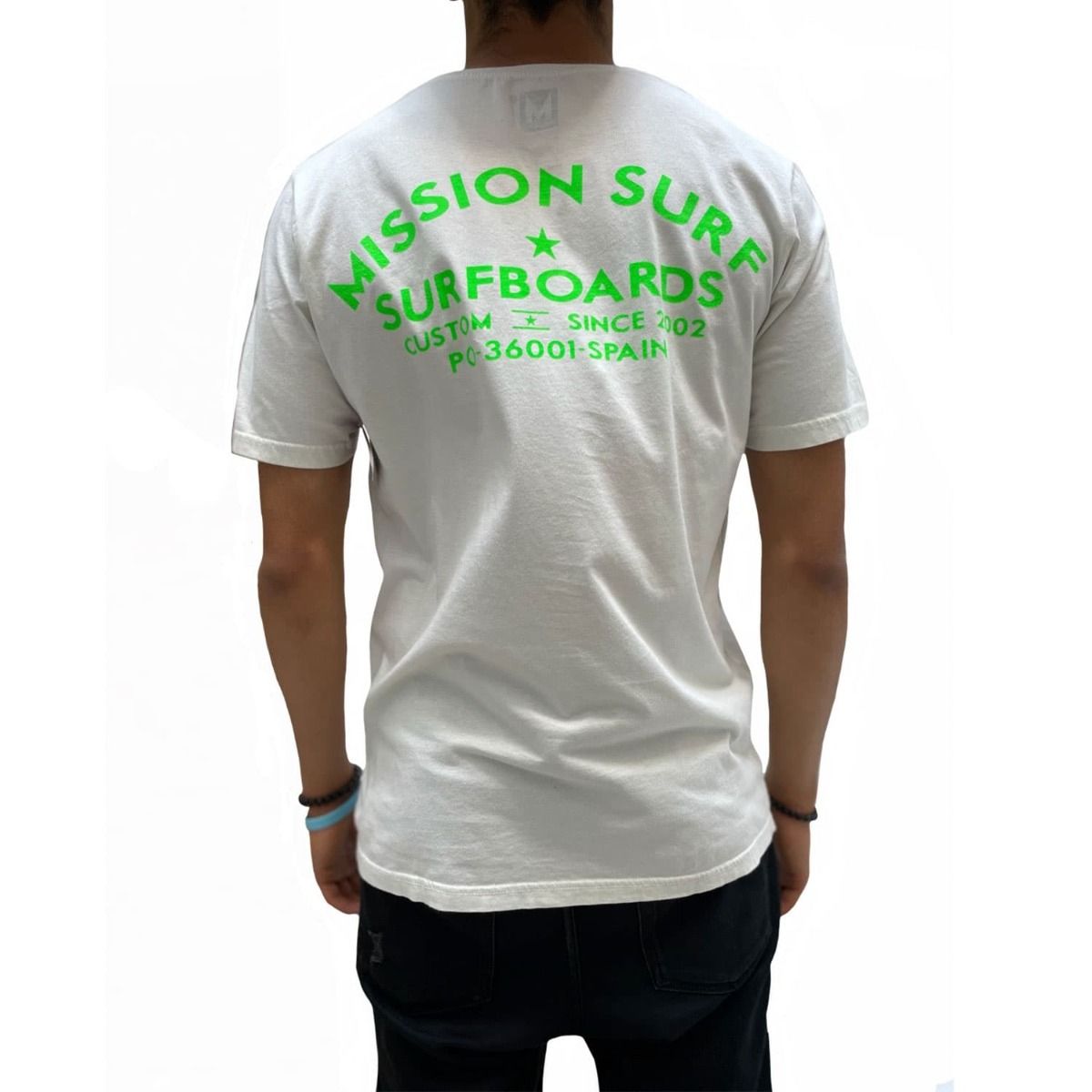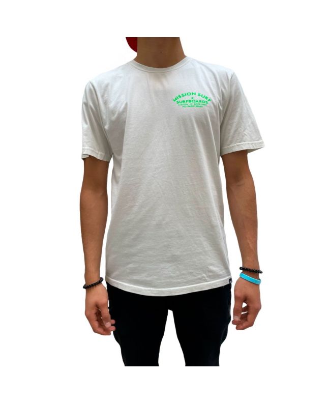 Esta camiseta de corte regular cuenta con cuello redondo, manga corta y la leyenda "Mission Surfboards. Custom since 2002. PO-36001-Spain" estampado en el lado izquierdo del pecho y en la espalda.