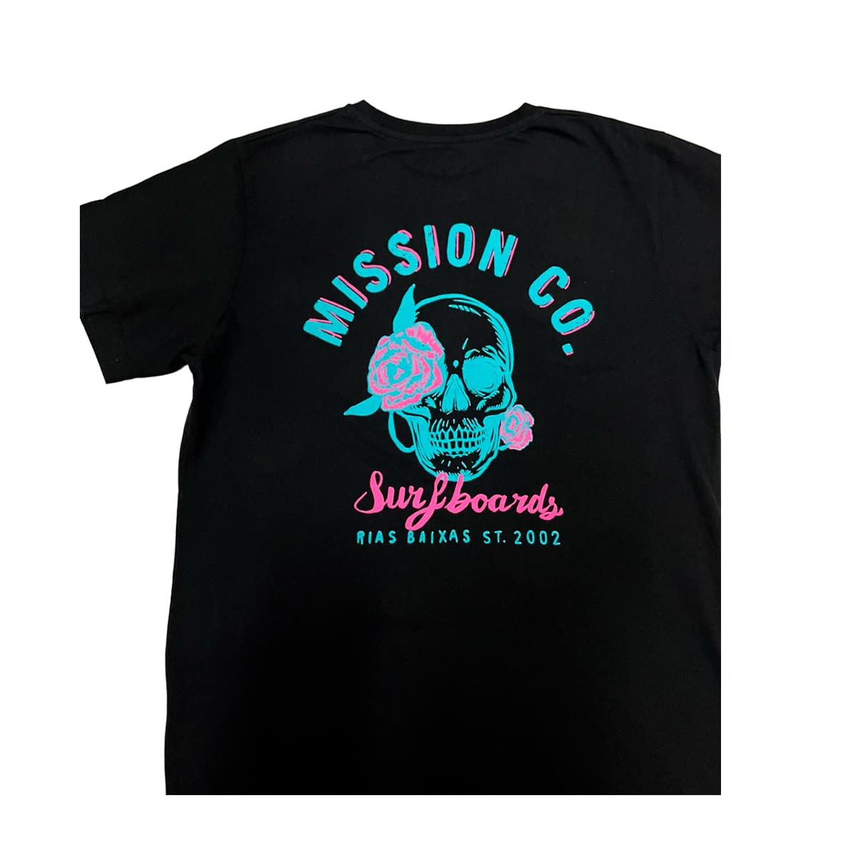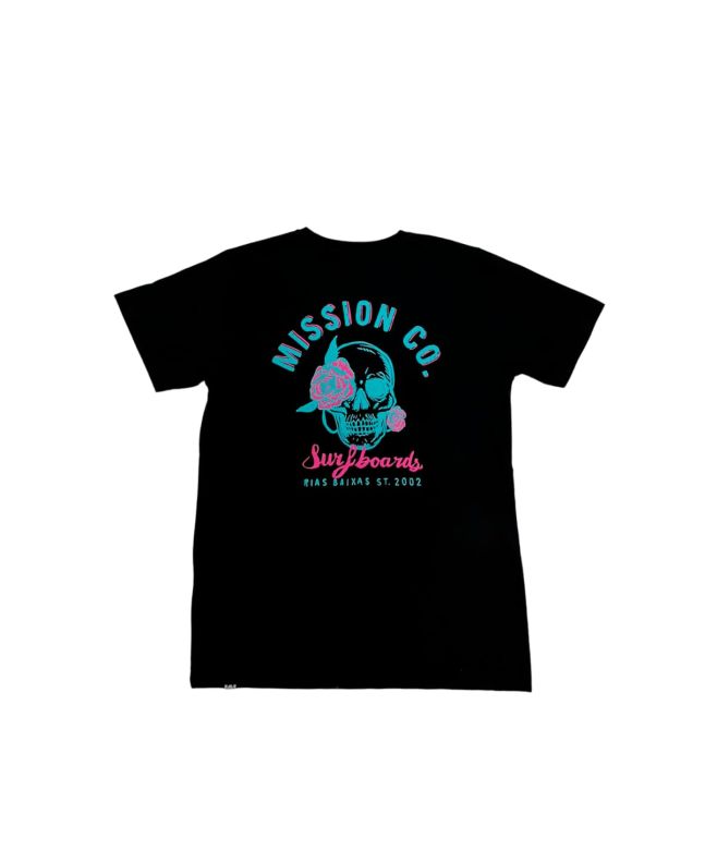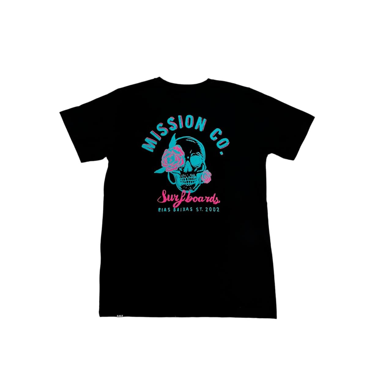 Esta camiseta surfera juvenil de corte clásico cuenta con cuello redondo, manga corta, mangas y dobladillo inferior acanalados, una pequeña etiqueta con la "M" de Mission tejida en el dobladillo, serigrafiados en tonos neón delanteros y posteriores, una rosa con la inscripción "Mission Co. Surfboards" impresa en la parte delantera izquierda y la calavera con la rosa de Mission y la inscripción "Mission Co. Surfboards. Rías Baixas ST. 2002" impresos en la espalda.
