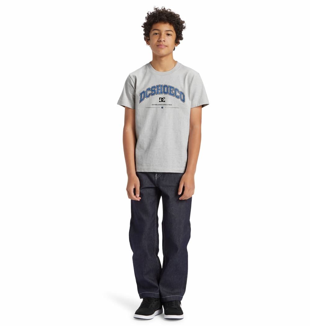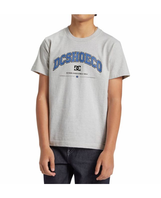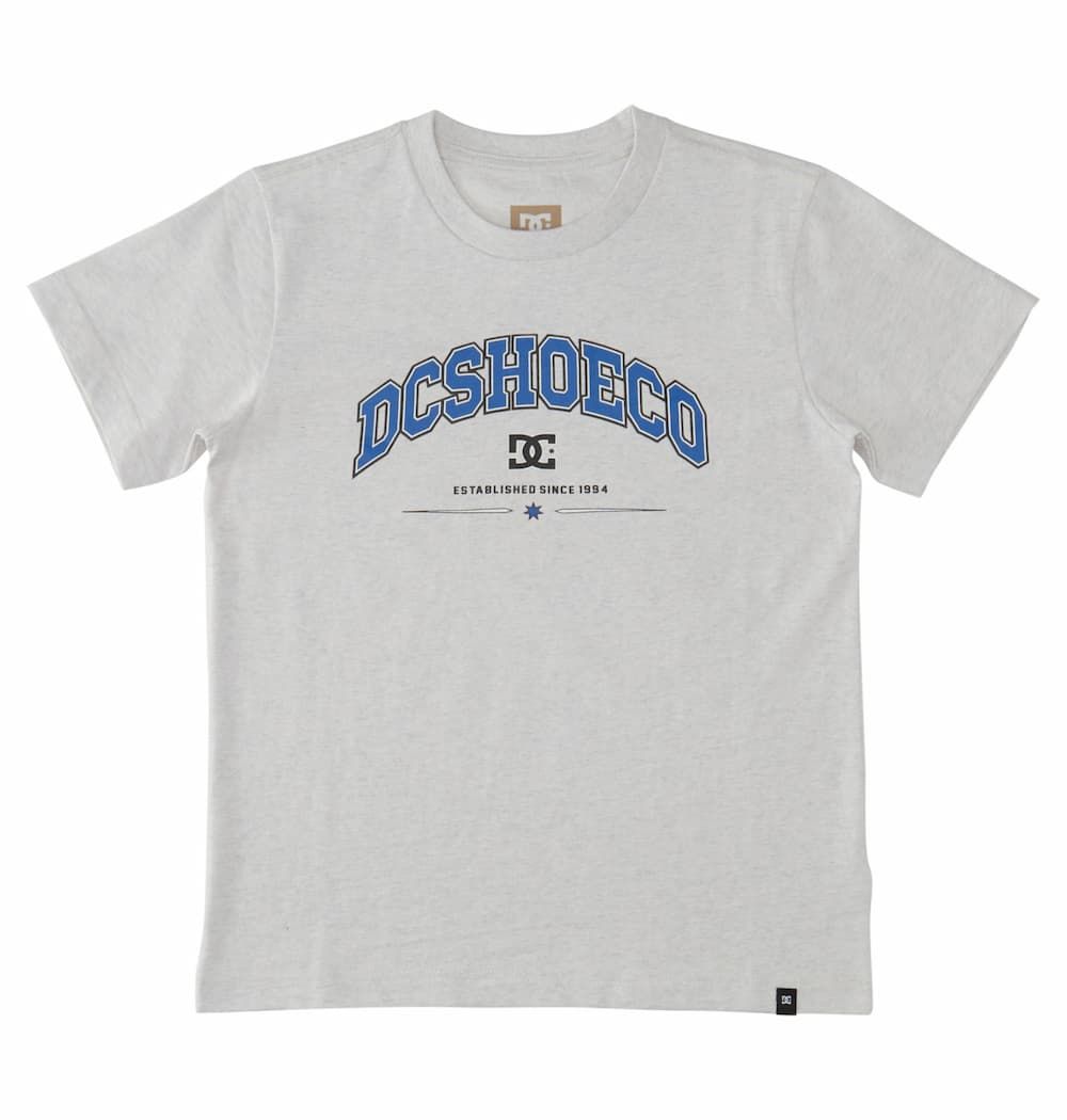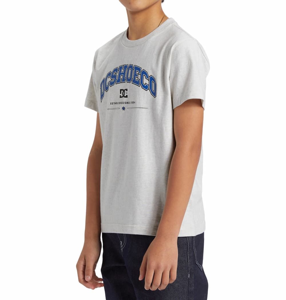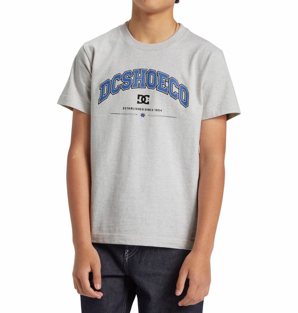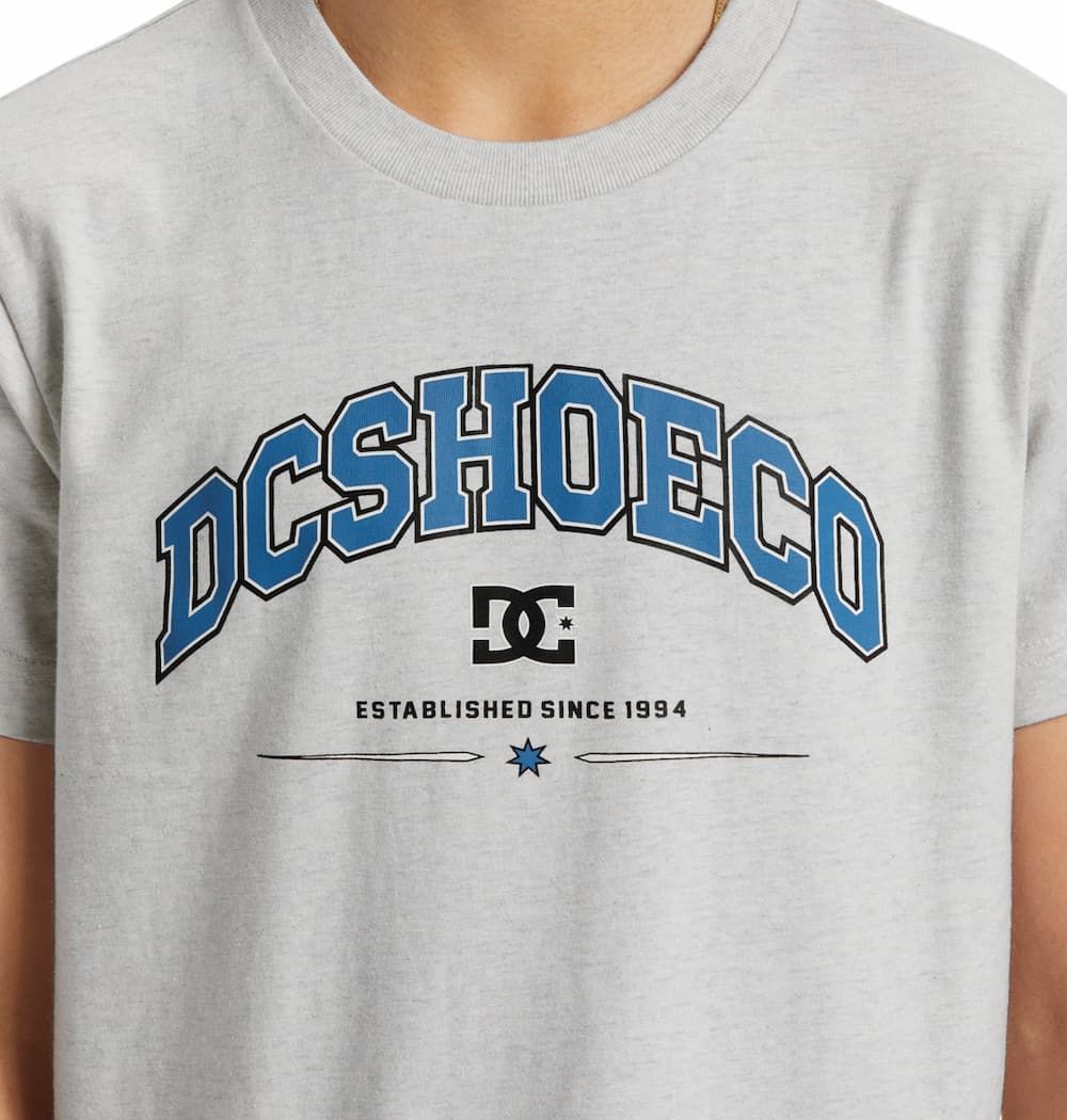 Esta camiseta juvenil gris presenta corte regular, cuello redondo acanalado, manga corta, serigrafiado DCSHOECO-Established since 1994 impreso en la parte delantera, junto con una pequeña etiqueta de la marca tejida en el dobladillo.