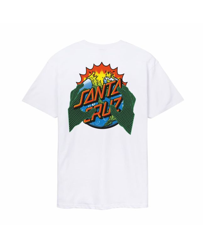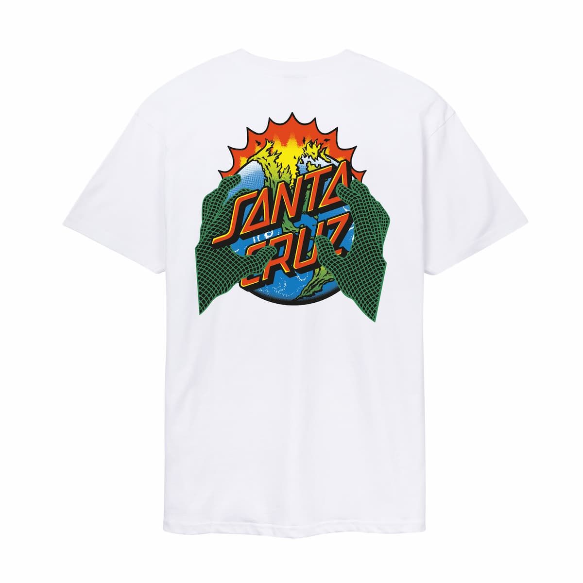 En el pecho y, especialmente, en la espalda, el arte de Kendall cobra vida con una ilustración potente y psicodélica que fusiona una explosión de color, energía y actitud skater. El clásico logotipo de Santa Cruz emerge de un mundo en llamas, sostenido por unas manos que intensifican el dramatismo del diseño.