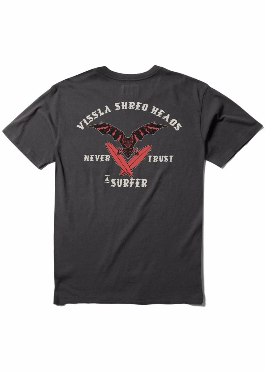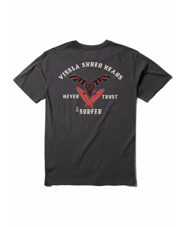 Su corte moderno y su bolsillo en el pecho con serigrafía discreta de Vissla se complementan con un potente gráfico en la espalda: un murciélago con dos tablas de surf y las provocadoras frases "Vissla Shred Heads - Never Trust a Surfer". Un guiño perfecto al espíritu libre y atrevido de la comunidad surfera.
