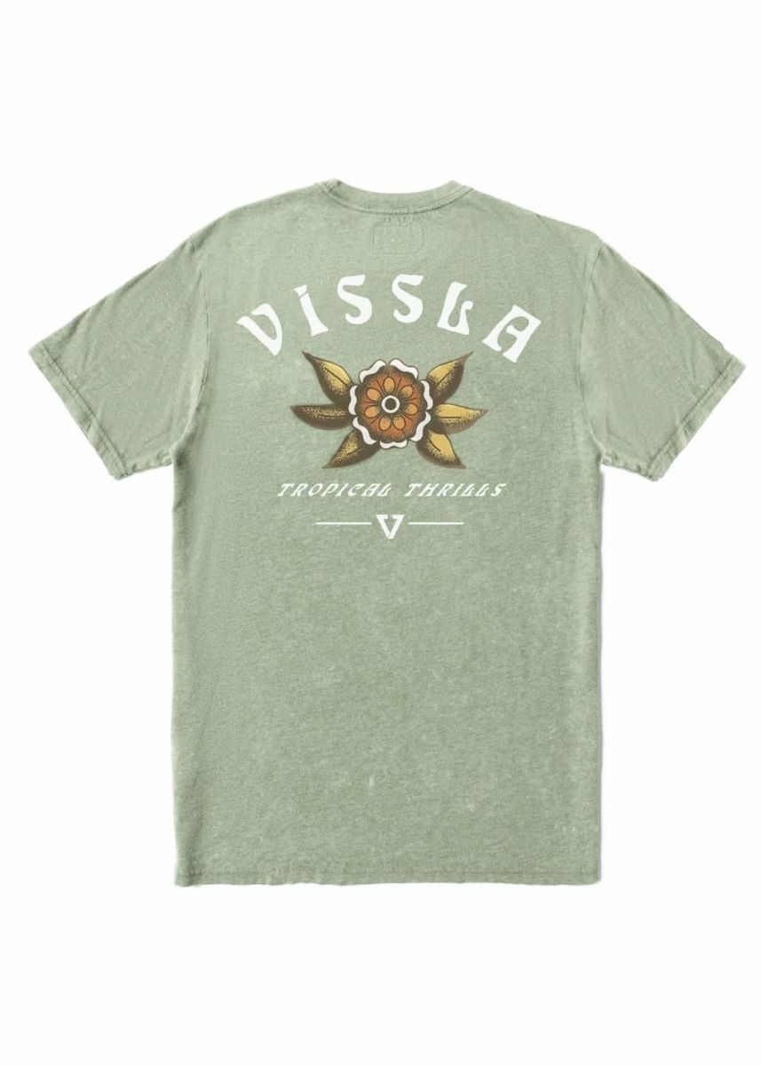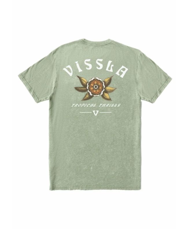 En la parte trasera, una ilustración serigrafiada en tonos cálidos protagoniza la camiseta con el logo de Vissla y el mensaje “Tropical Thrills”, evocando el surf en paraísos exóticos. El frontal incorpora un logotipo arqueado discreto sobre el pecho. Todo el diseño se completa con etiquetas tejidas en la costura lateral y en la parte interior del cuello, que refuerzan la identidad de la marca sin renunciar a la comodidad.