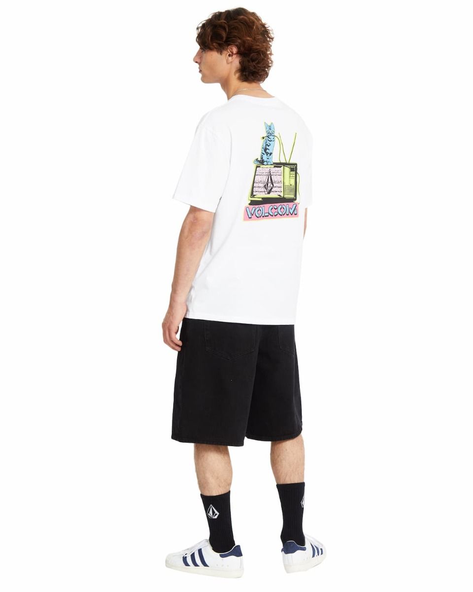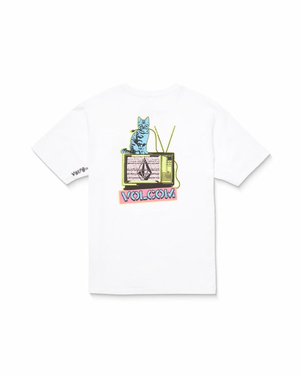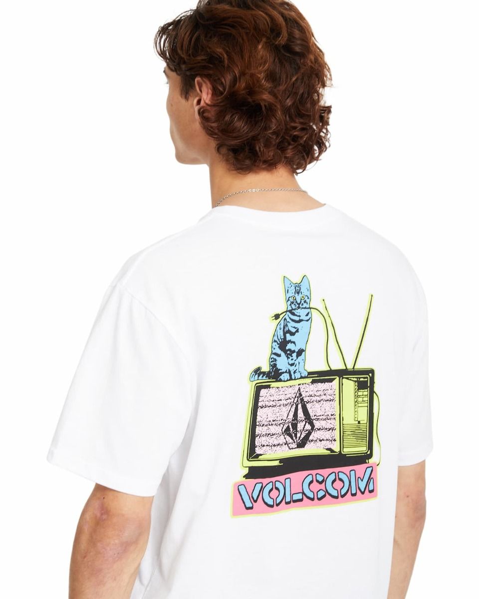 Confeccionada en tejido suave y transpirable de 100% algodón orgánico (160g), esta camiseta presenta un estampado en el pecho de un televisor vintage con interferencias y el logo de Volcom, sobre el que descansa un gato azul. En la parte trasera, el diseño se amplía con una ilustración más grande del mismo televisor y gato, resaltado con colores neón en amarillo y rosa, aportando un estilo vibrante y retro. Además, la manga izquierda incorpora un pequeño estampado con la palabra "Volcom" en negro, añadiendo un detalle distintivo.