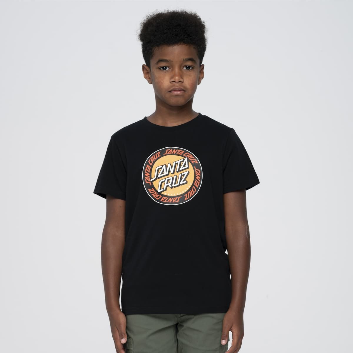 Esta camiseta infantil de ajuste regular cuenta con cuello redondo, manga corta y el logo de Santa Cruz Skateboards dentro de un anillo impreso en la parte delantera.