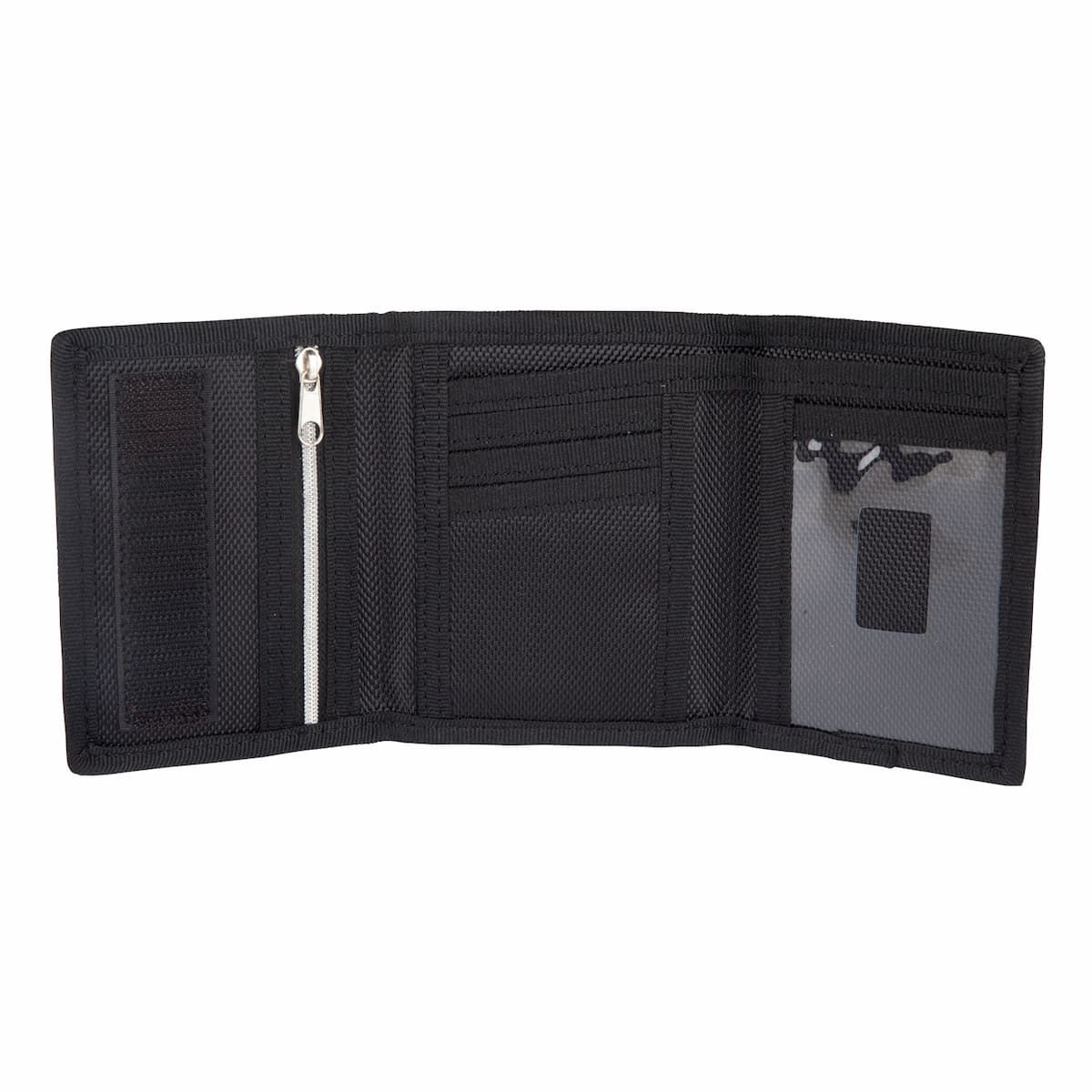Esta cartera con diseño de triple pliegue cuenta con cierre de velcro, bolsillo para monedas con cierre de cremallera, ranuras para tarjetas y billetes, ventana de identificación y el logo de Santa Cruz estampado en la zona frontal.