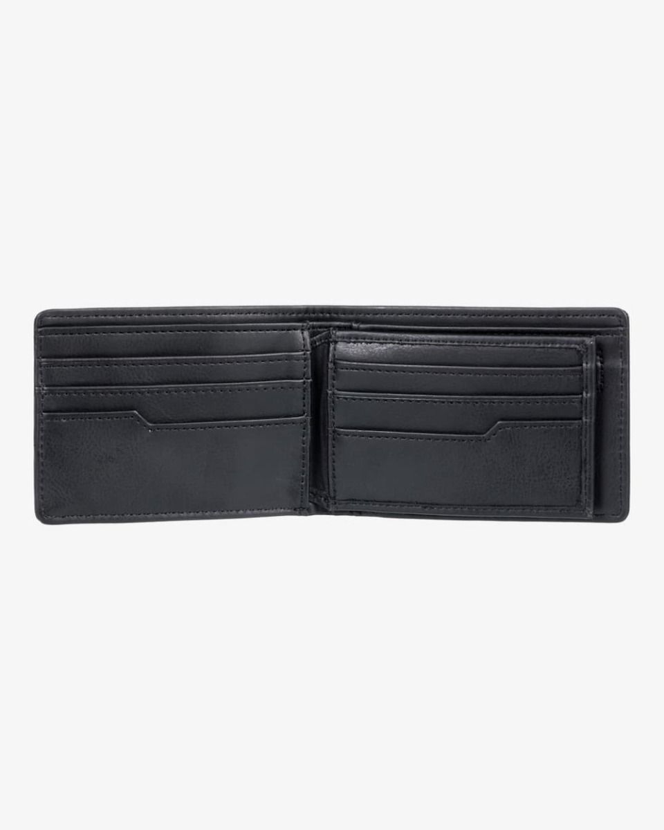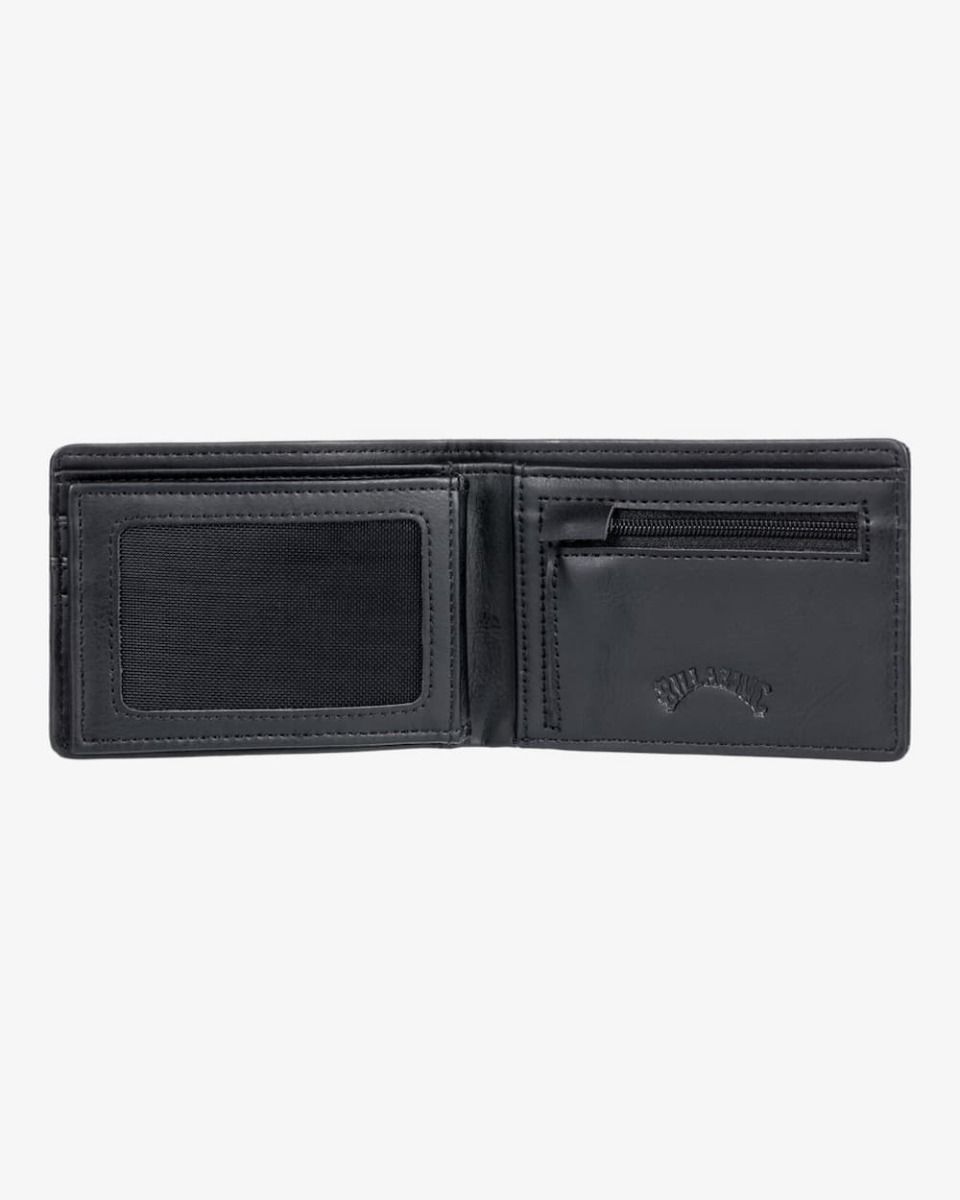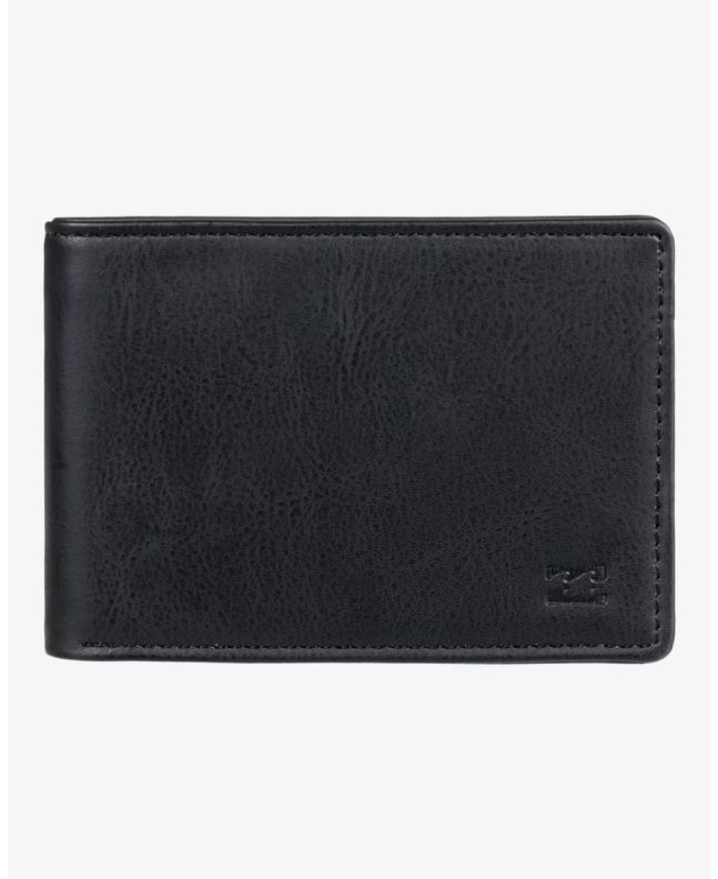 Esta elegante cartera negra de tamaño slim en cuero artificial cuenta con tres pliegues, billetera, bolsillo monedero con cremallera, múltiples ranuras interiores para tarjetas, ventana de malla para el DNI, diseño en relieve de la ola de Billabong en la parte delantera y el logo de la marca grabado en el interior.