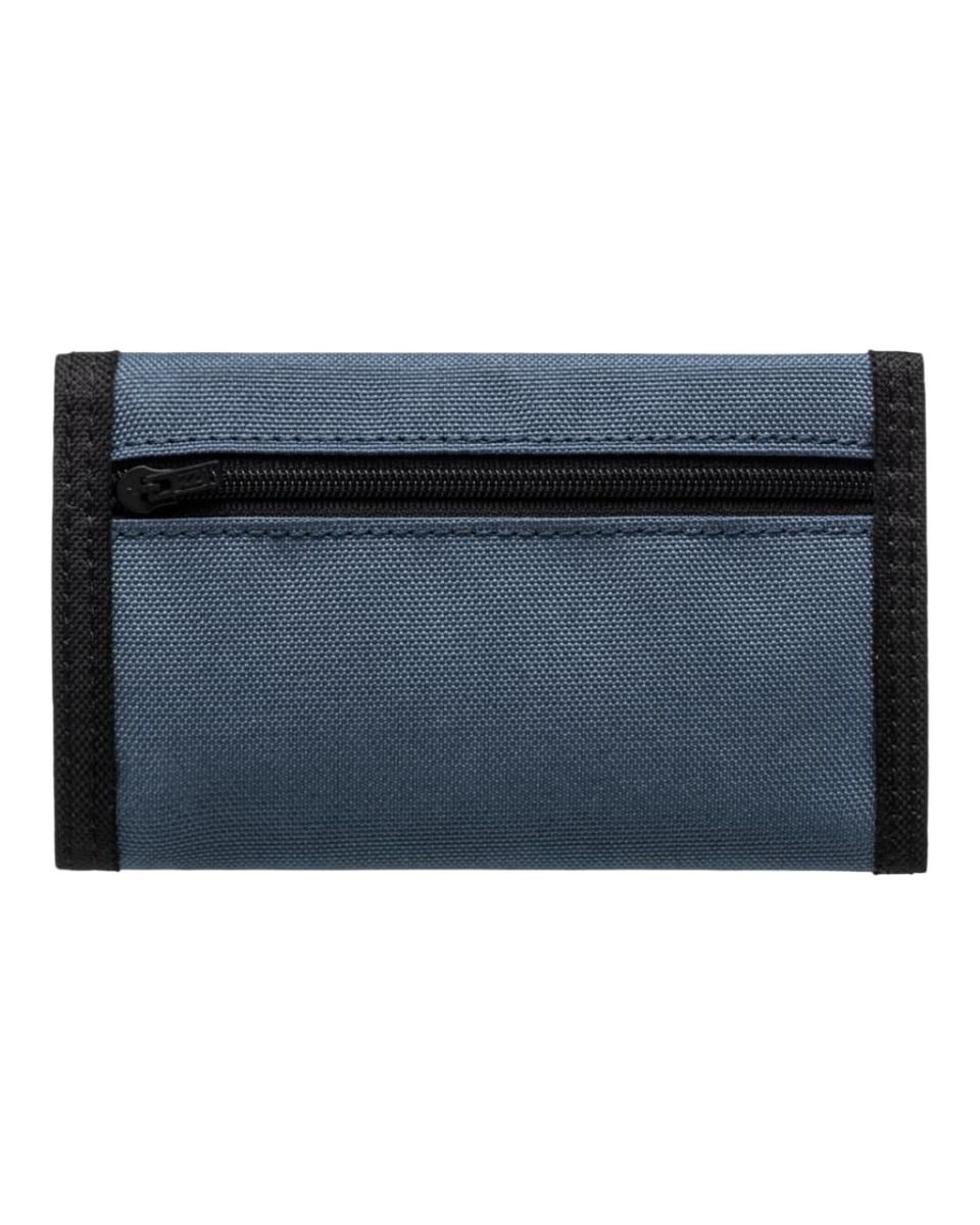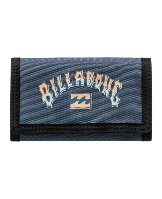 Esta práctica y ligera billetera en tono azul glacial está confeccionada con tejido ecológico y resistente de 100% poliéster *reciclado. Su diseño de triple pliegue incluye un cierre autoadherente de velcro, un compartimento con cremallera para billetes, un bolsillo exterior con cierre de cremallera para monedas y seis ranuras para tarjetas, ofreciendo espacio y seguridad para tus pertenencias. En la parte delantera, luce el logo en arco y de la ola de Billabong.