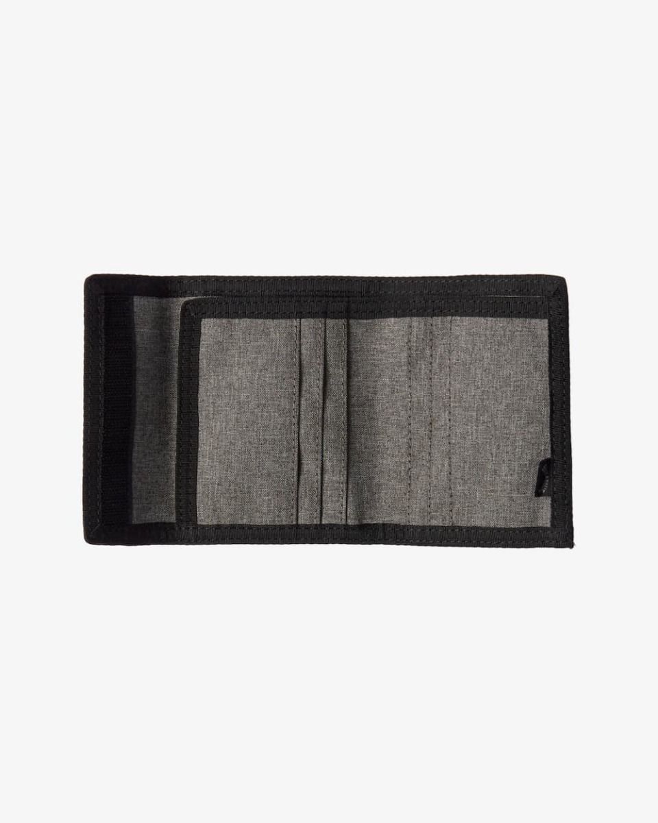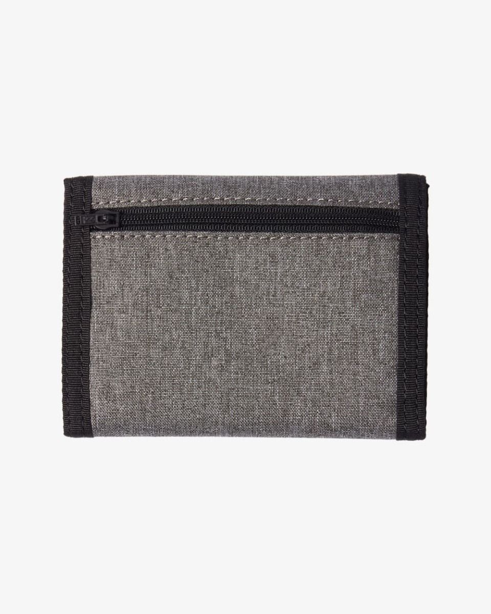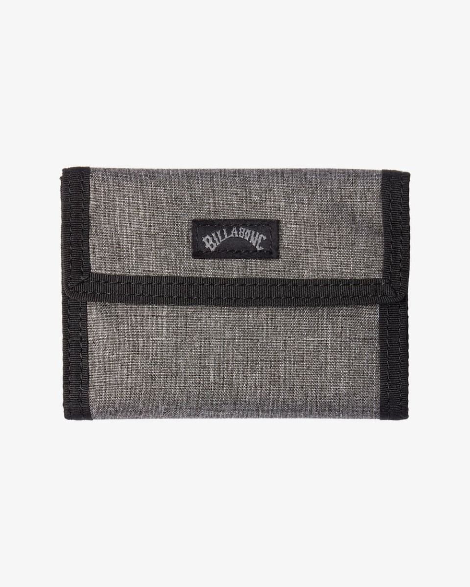 Esta billetera gris con diseño de triple pliegue cuenta con cierre autoadherente de velcro, compartimento para billetes, bolsillo exterior monedero con cierre de cremallera, 6 ranuras para tarjetas y un parche con el logo Billabong cosido en la parte delantera.
