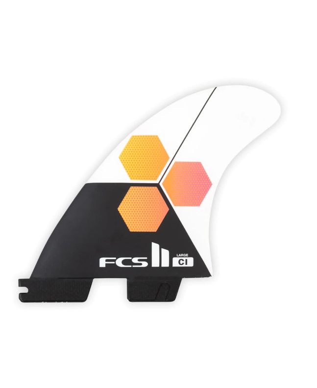 Las quillas para tabla de surf FCS II CI Tri Fins en color blanco (White) en talla L han sido fabricadas con Performance Core (PC) mediante un proceso de moldeo por transferencia de resina de varias capas.