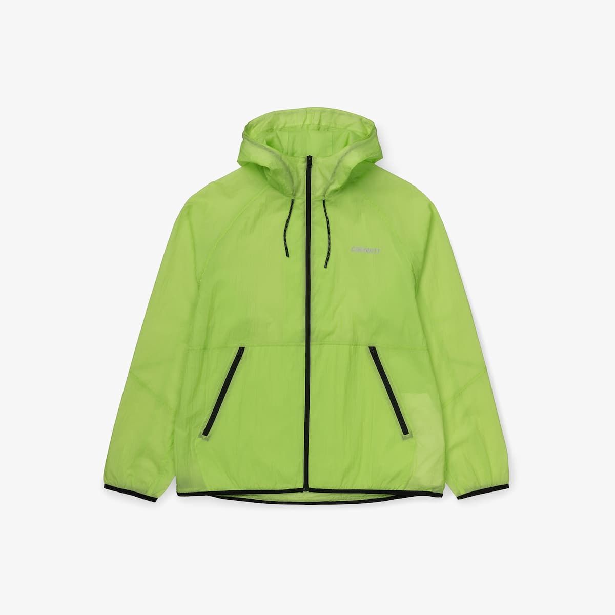 La chaqueta ligera de lluvia con capucha para hombre Turrell Jacket en tono lima y el logo en gris reflectante (Lime-Reflective Grey) de Carhartt WIP está confeccionada con 100% nailon Micro Ripstop (1oz).