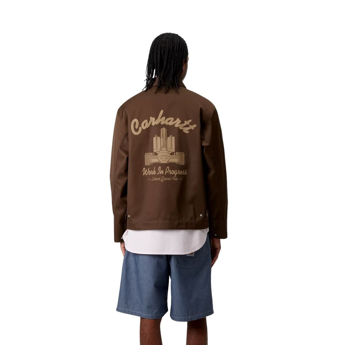 ✔ Gráfico trasero llamativo: Estampado de un coche de carreras acompañado del texto "Carhartt Work In Progress - Detroit Grand Prix" en tono marrón cacahuete (Peanut).