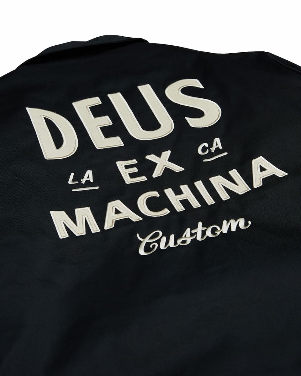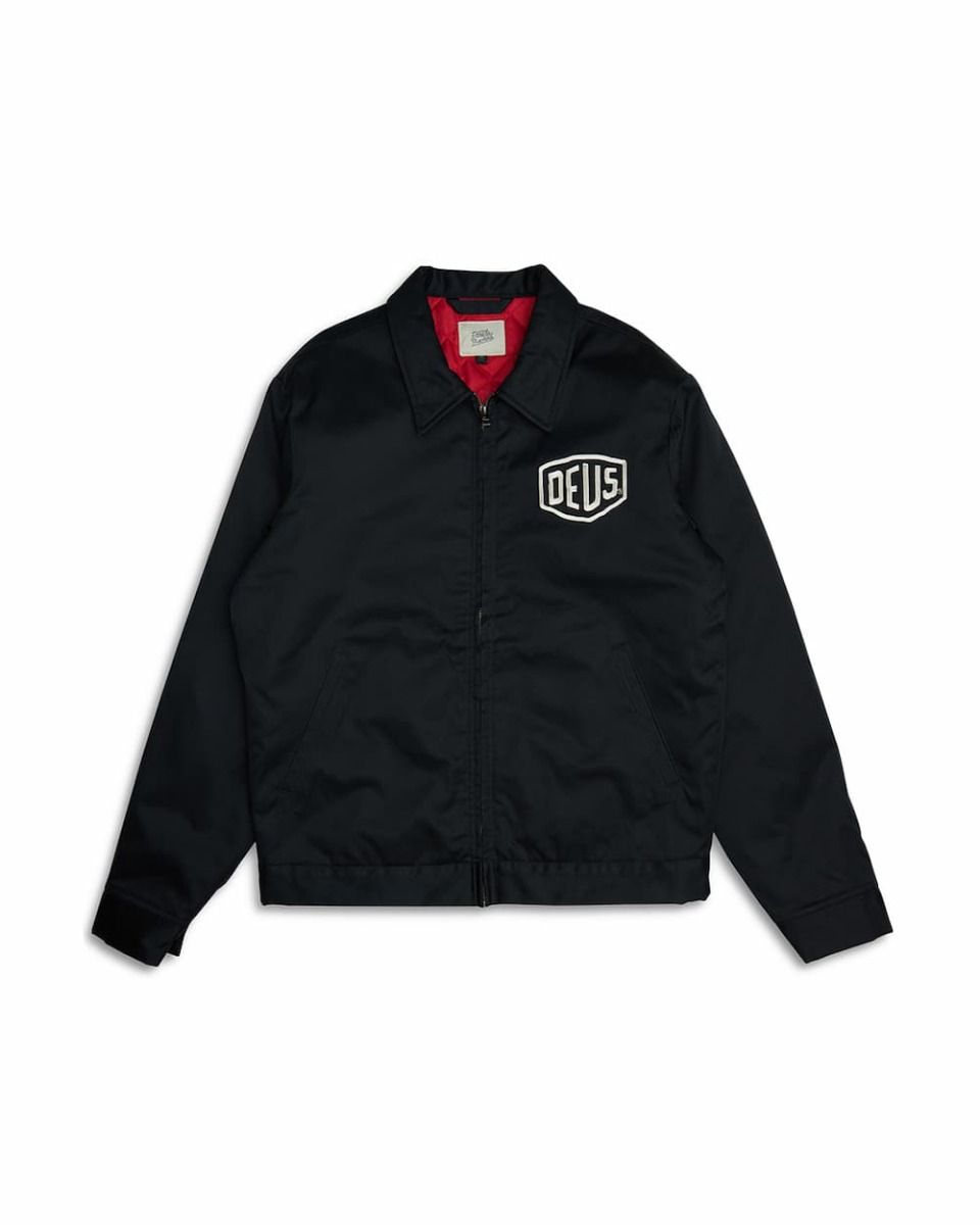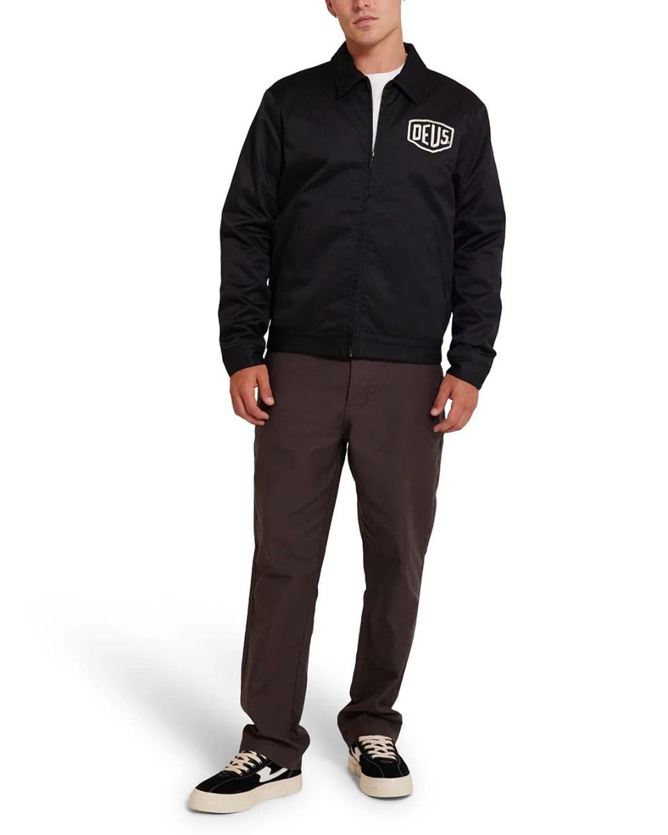 Esta cazadora Workwear, perteneciente a la Colección Classics de Deus, presenta ajuste regular, tejido sometido a lavado pesado en prenda para mayor suavidad, cierre frontal de cremallera completa, dos bolsillos laterales, cintura ajustable con botones a presión, el logo Shield de DEUS bordado en el lado izquierdo del pecho y la inscripción "Deus Ex Machina Custom. LA CA" bordada en la espalda.