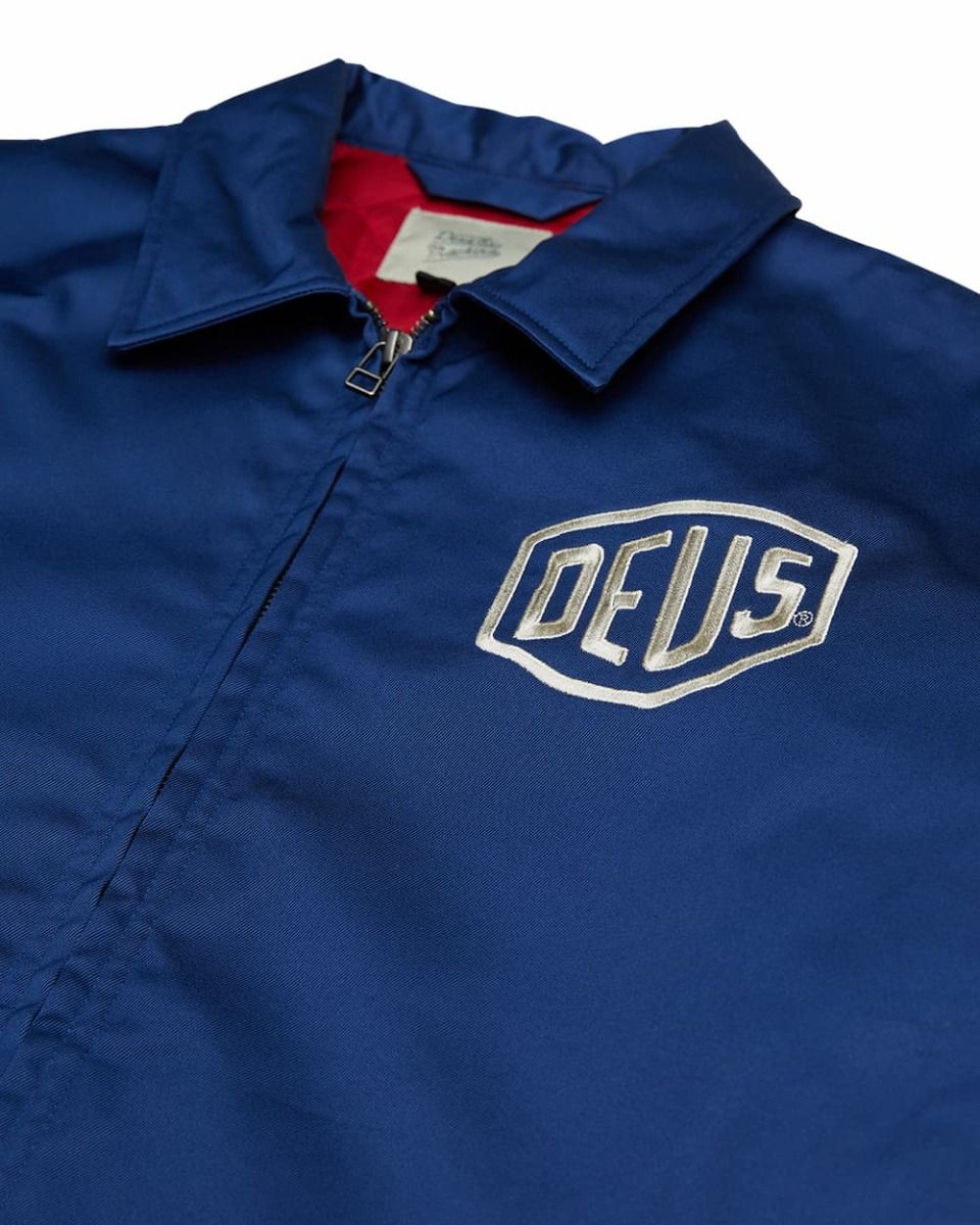 Esta cazadora Workwear Azul, perteneciente a la Colección Classics de Deus, presenta ajuste regular, tejido sometido a lavado pesado en prenda para mayor suavidad, cierre frontal de cremallera completa, dos bolsillos laterales, cintura ajustable con botones, el logo Shield de DEUS bordado en el lado izquierdo del pecho y la inscripción "Deus Ex Machina Custom. LA CA" bordada en la espalda.