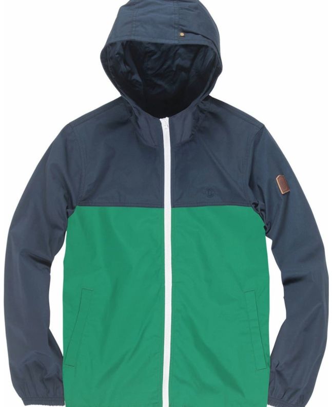 Esta cazadora ligera cuenta con revestimiento resistente al agua de 1000mm, mangas forradas de tafetán, cierre frontal de cremallera Vislon, capucha, puños elásticos, dobladillo inferior ajustable, dos bolsillos de ojal, el logo del árbol de Element bordado en el lado izquierdo del pecho y un parche Element de cuero sintético cosido en la manga izquierda.