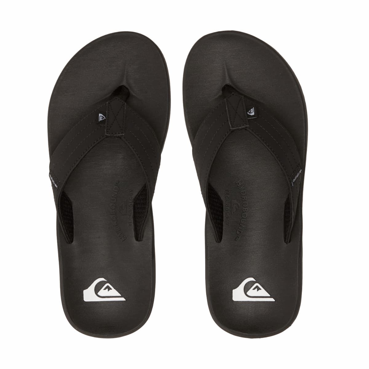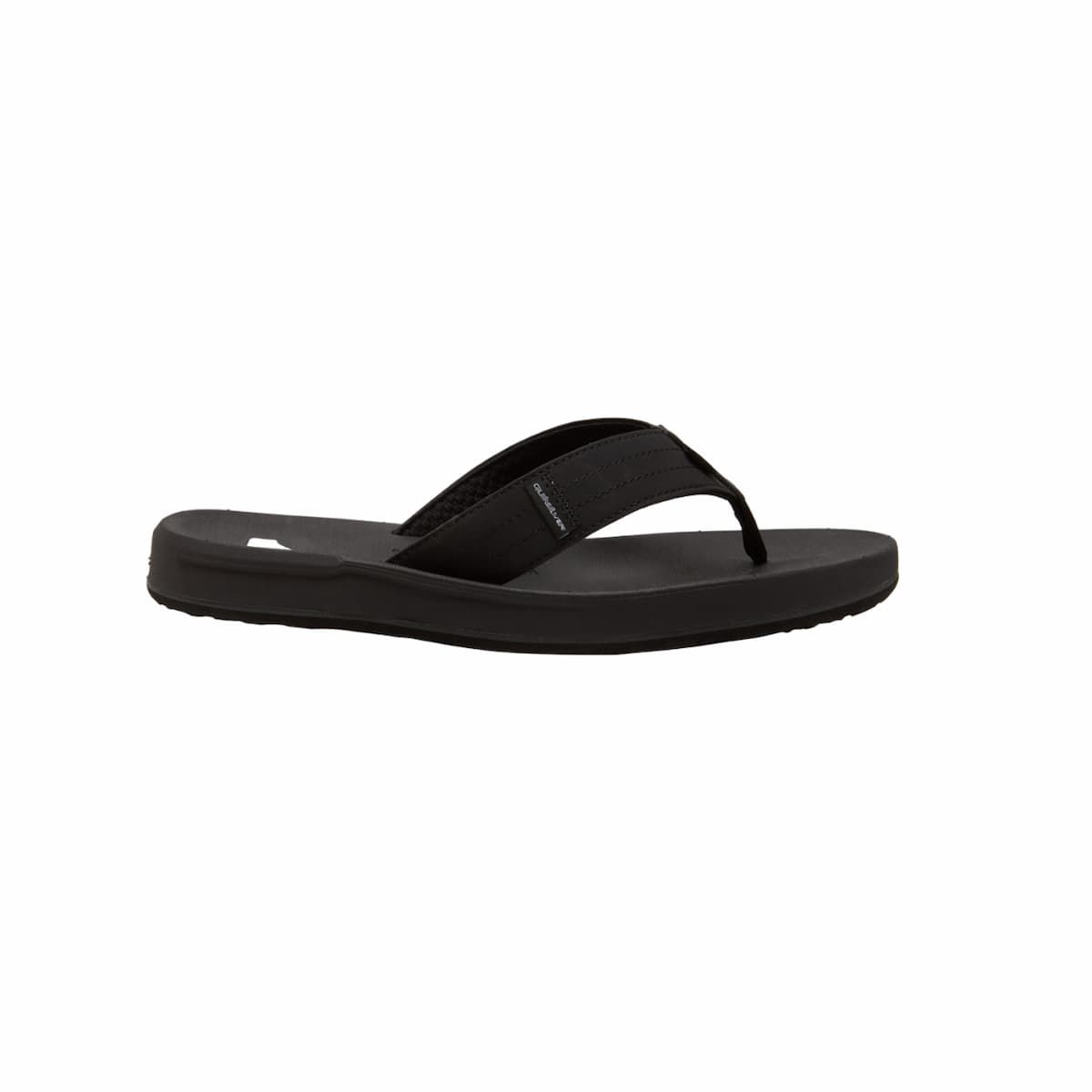 Estas sandalias playeras de dedo negras cuentan con parte superior de piel sintética vegana impermeable, plantilla Hydrobound™ blanda con perfil anatómicamente correcto para mayor comodidad, forro texturizado transpirable, suela exterior de goma anti-deslizante con muescas multi-ángulo con el logo de Quiksilver para mayor tracción, el logo de de la ola y la montaña grabado en la plantilla, junto con una etiqueta de la marca tejida en la correa.