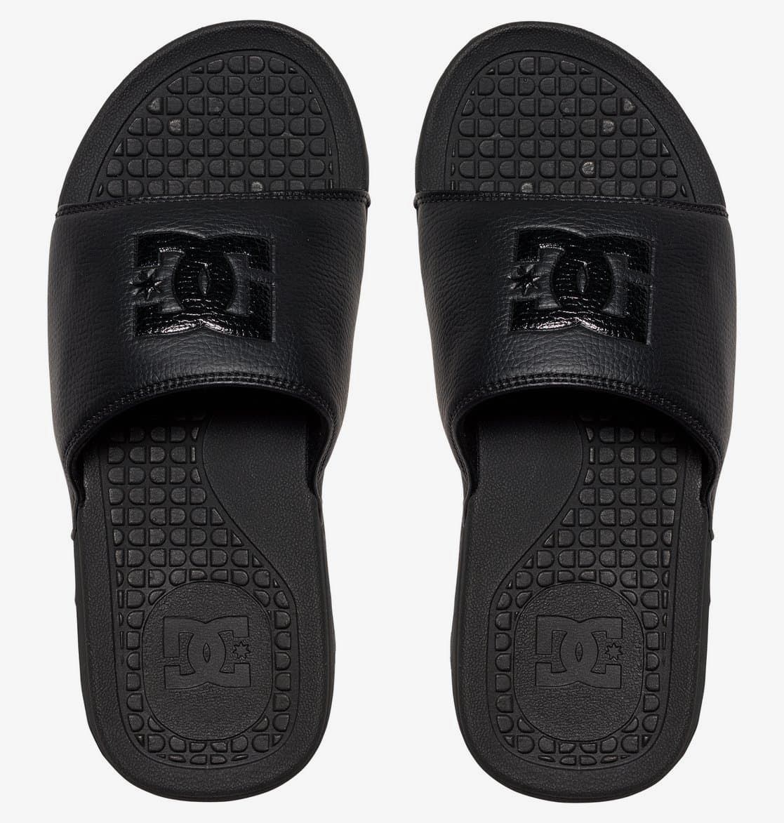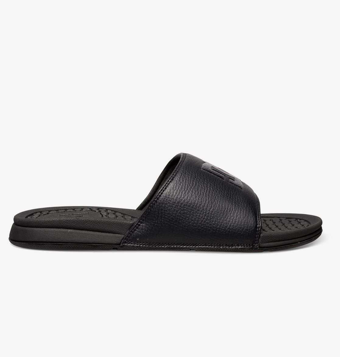 Las chanclas slider para hombre Bolsa de DC Shoes All Black en color negro con el logo DC negro están confeccionadas con cuero y goma sintéticos.