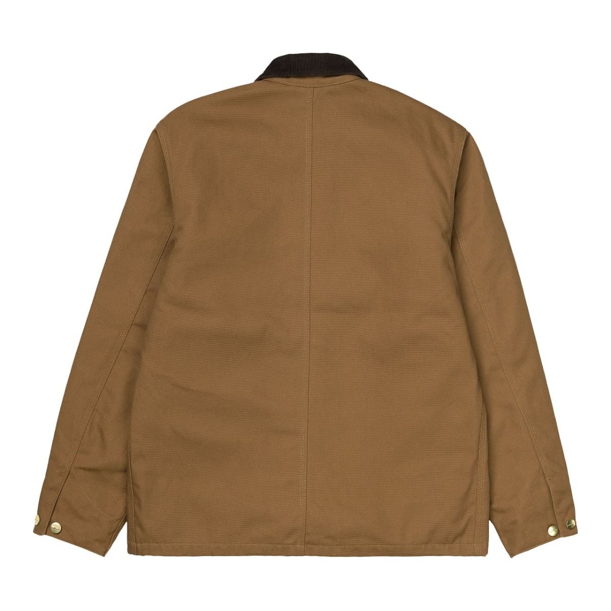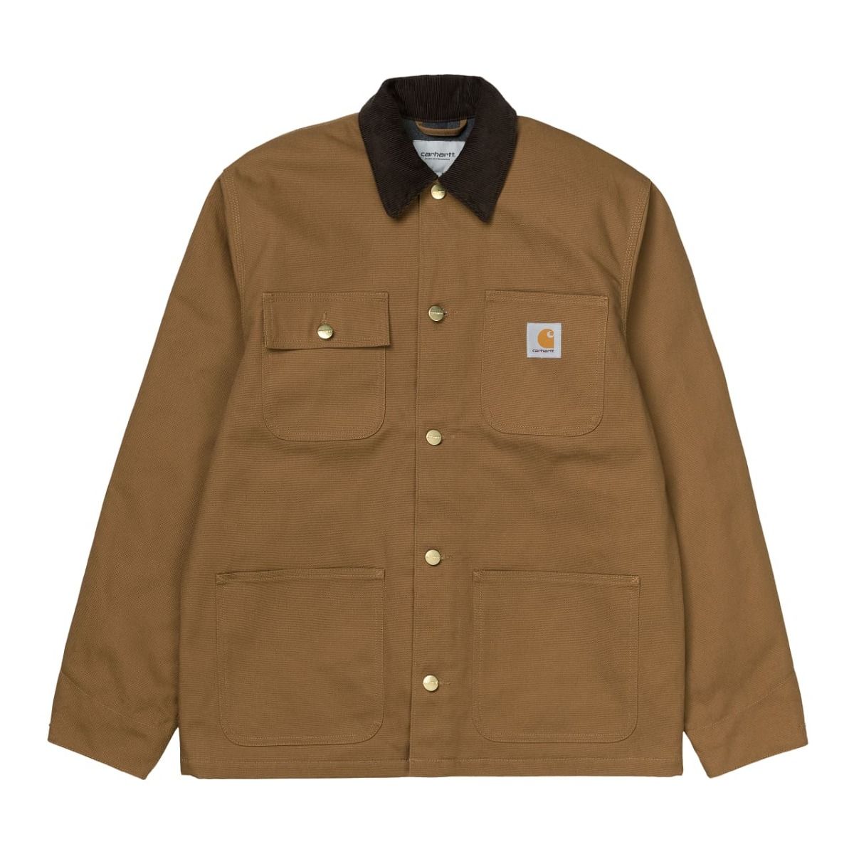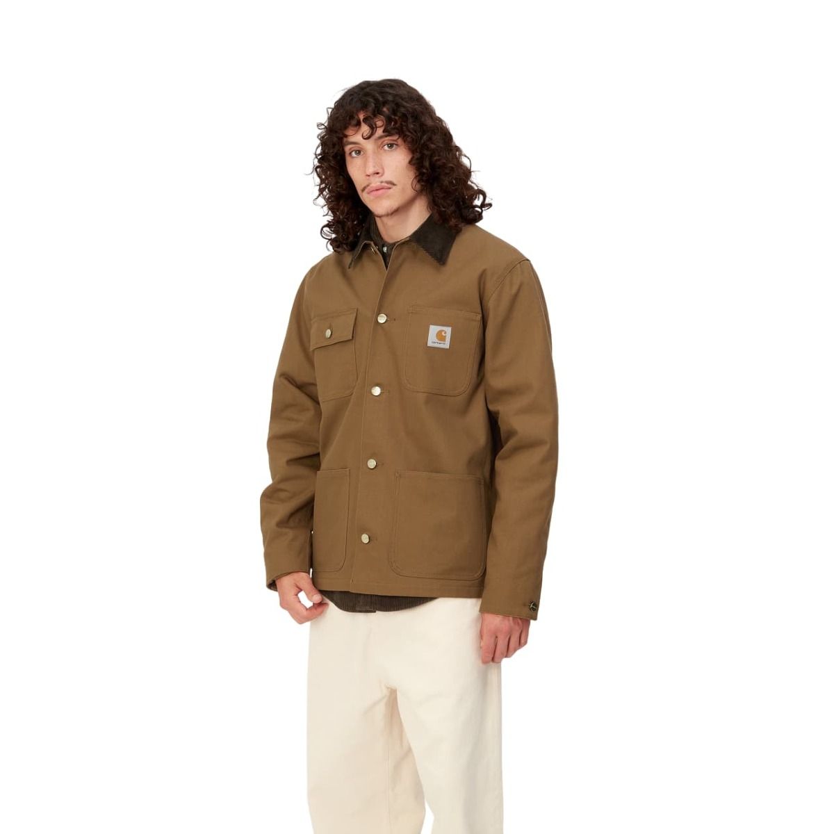 Esta chaquetón presenta un diseño inspirado en la estética clásica de la ropa de trabajo, tejido que se va suavizando con el uso, ajuste regular, cierre frontal de botones, cuerpo forrado de manta para conservar mejor el calor, mangas forradas de nailon, cuello de pana, puntadas triples, cuatro bolsillos de parche delanteros, puños ajustables y una etiqueta cuadrada de Carhartt cosida en el bolsillo superior izquierdo.