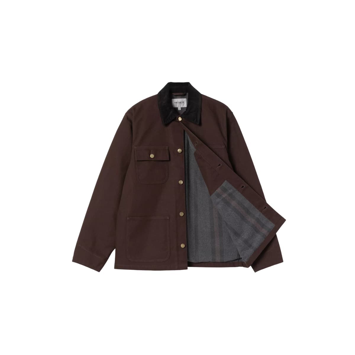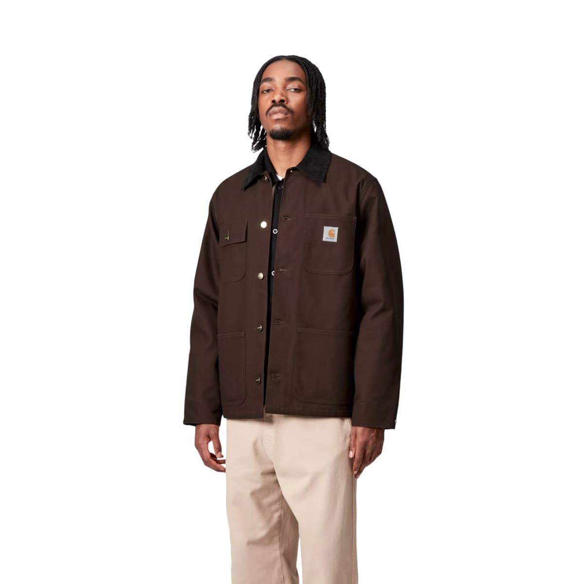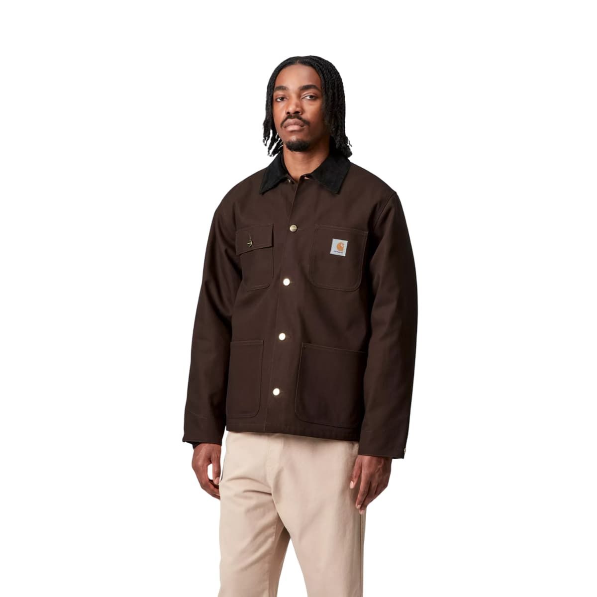 Este chaquetón incluye cierre frontal con botones metálicos, cuatro bolsillos de parche funcionales, puños ajustables y costuras triples que refuerzan su durabilidad. El logo cuadrado de Carhartt WIP cosido en el bolsillo superior izquierdo aporta autenticidad y carácter.