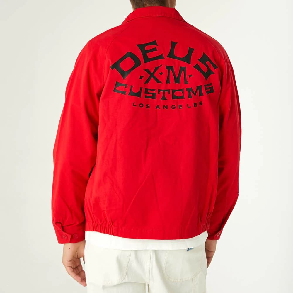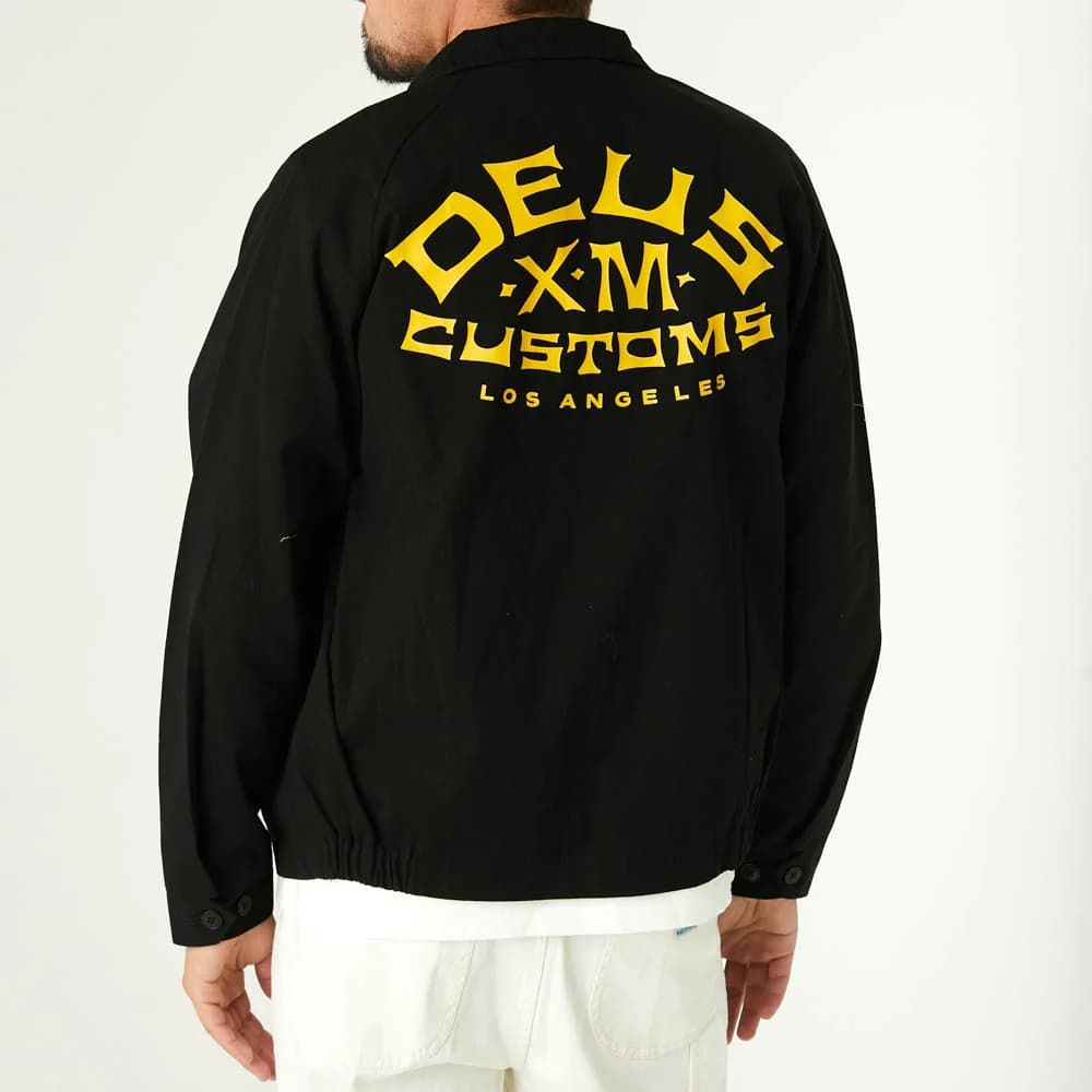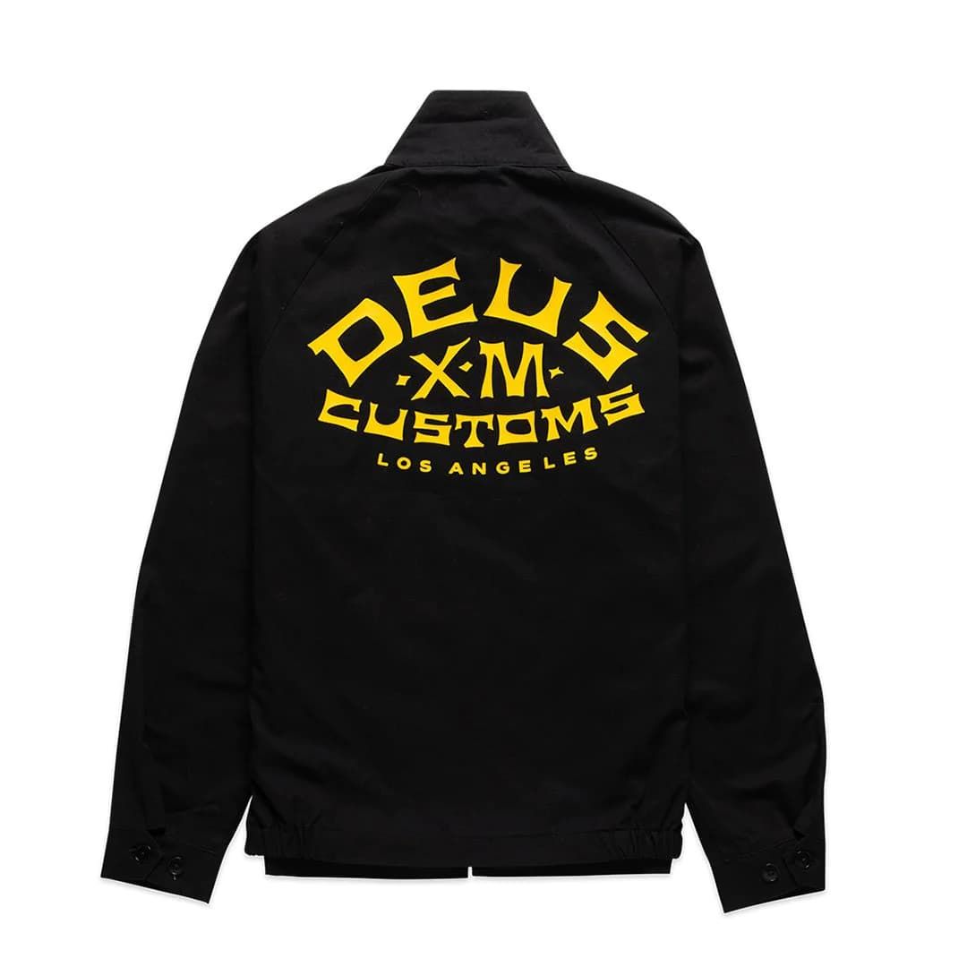 Esta chaqueta de ajuste relajado cuenta con cuello subido, cierre frontal de cremallera completa bidireccional, bolsillos laterales, el logo de Deus estampado en el pecho izquierdo y una impresión trasera con la leyenda “Deus X M Customs Los Ángeles”.