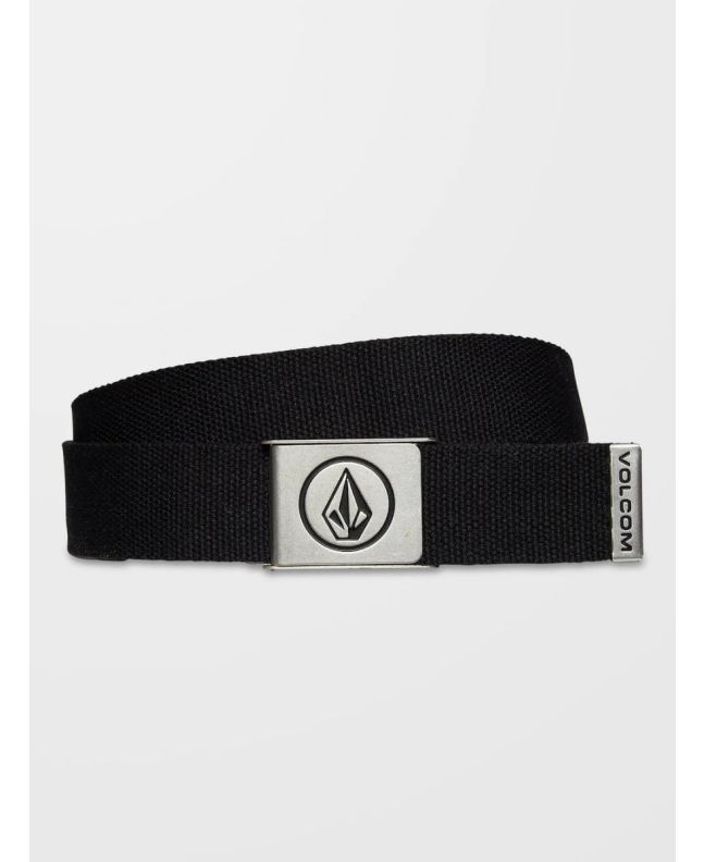 Este cinto masculino cuenta con cierre de hebilla metálica de clip, punta metálica, abrebotellas en la parte trasera de la hebilla, logo Stone grabado en relieve en la hebilla, inscripción Volcom en la punta, 3,8cm de ancho (1,5") y una longitud de 114cm (45").