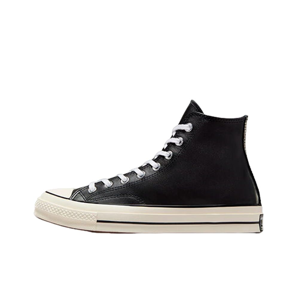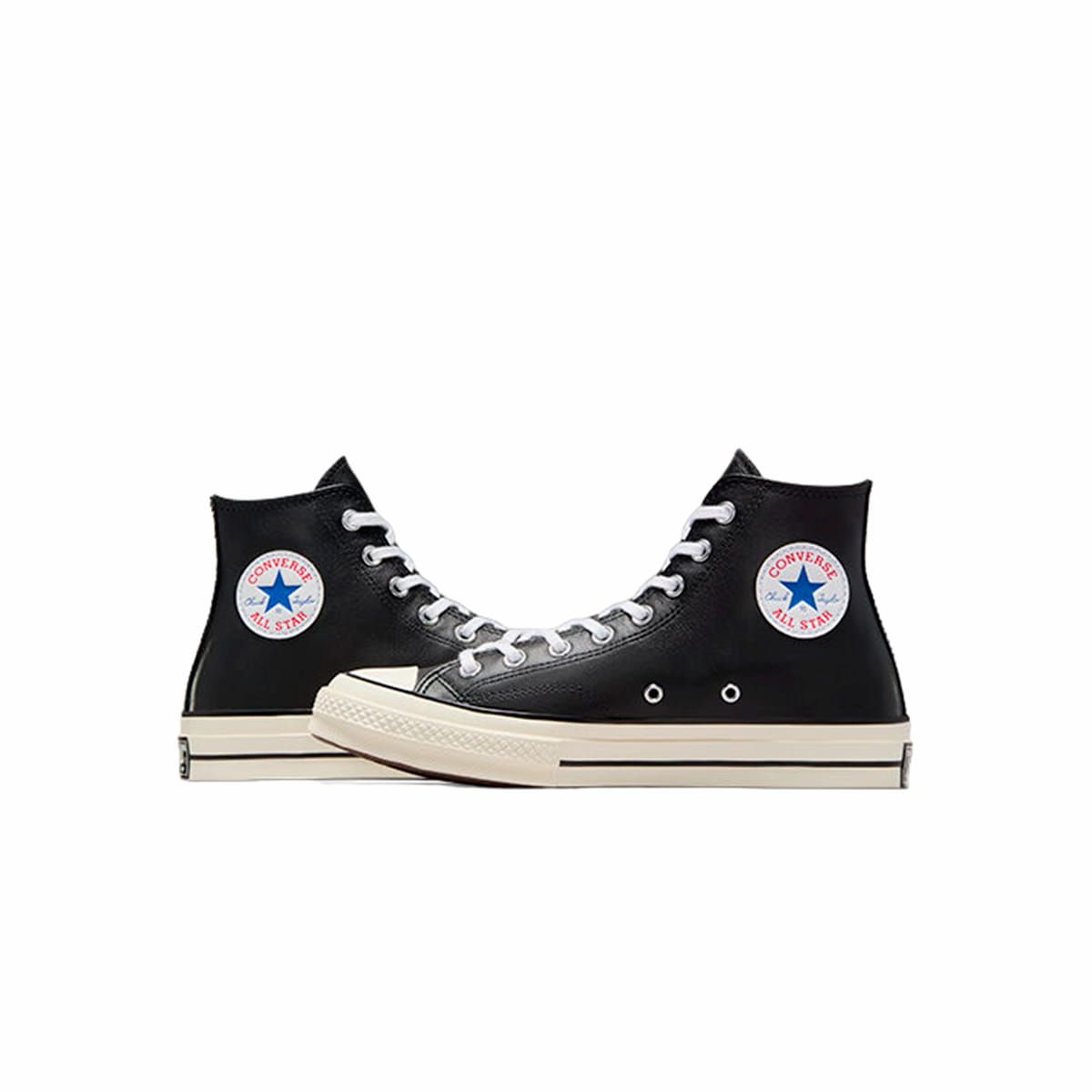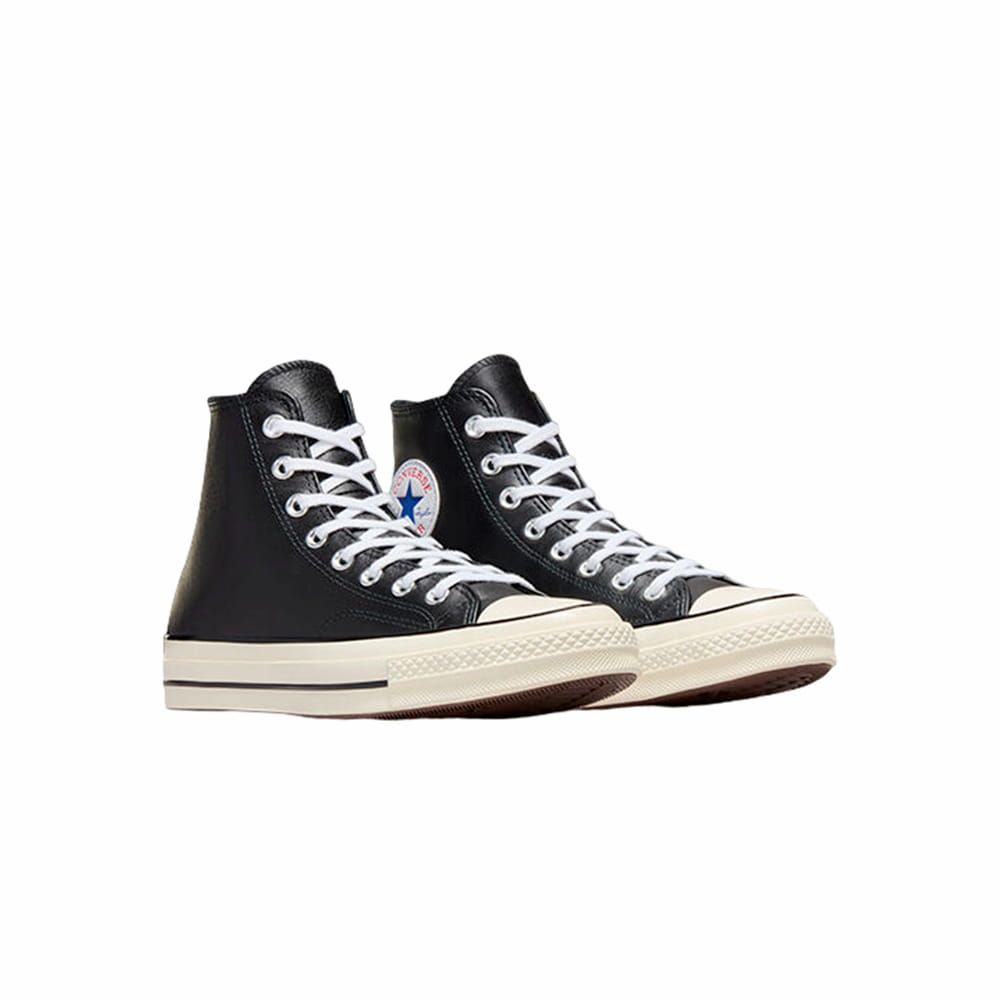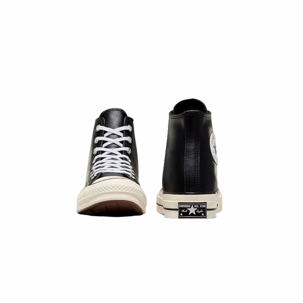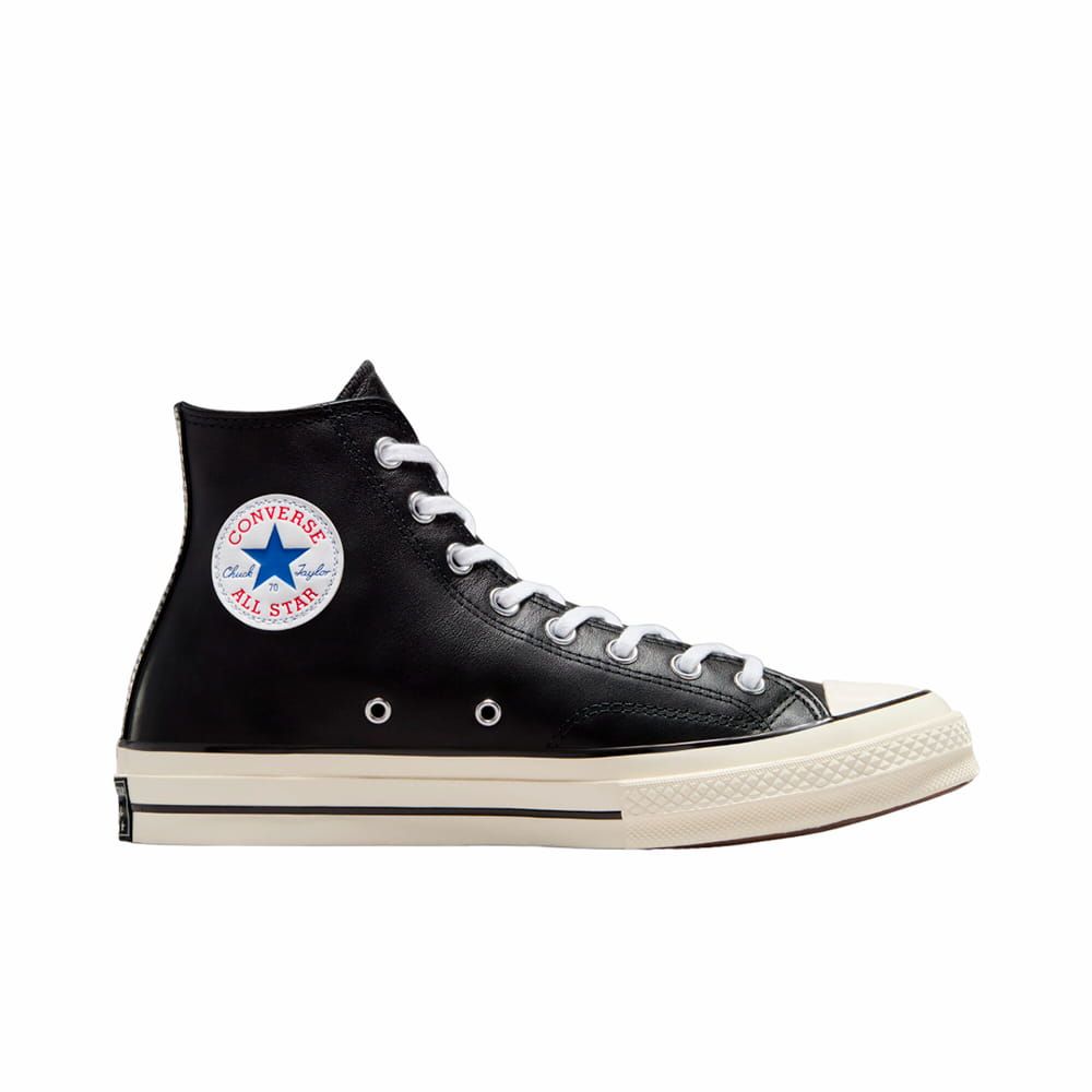 Las sneakers de caña alta Chuck 70 Hi Leather Black-White-Egret cuentan con parte superior de piel Premium color negro, plantilla con amortiguación OrthoLite para mayor comodidad y ligereza, los clásicos ojales de aluminio, cordones planos de algodón, el parche Chuck de estilo vintage en piel sintética en el tobillo, suela exterior de goma con patrón de tracción de diamante y el logo All Star vintage impreso en el talón.